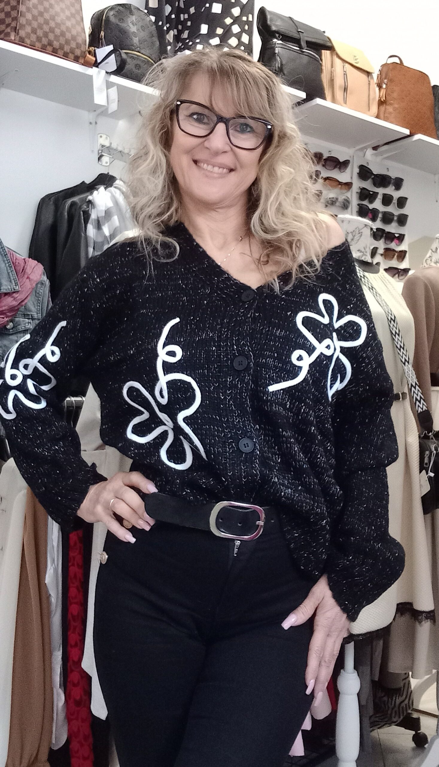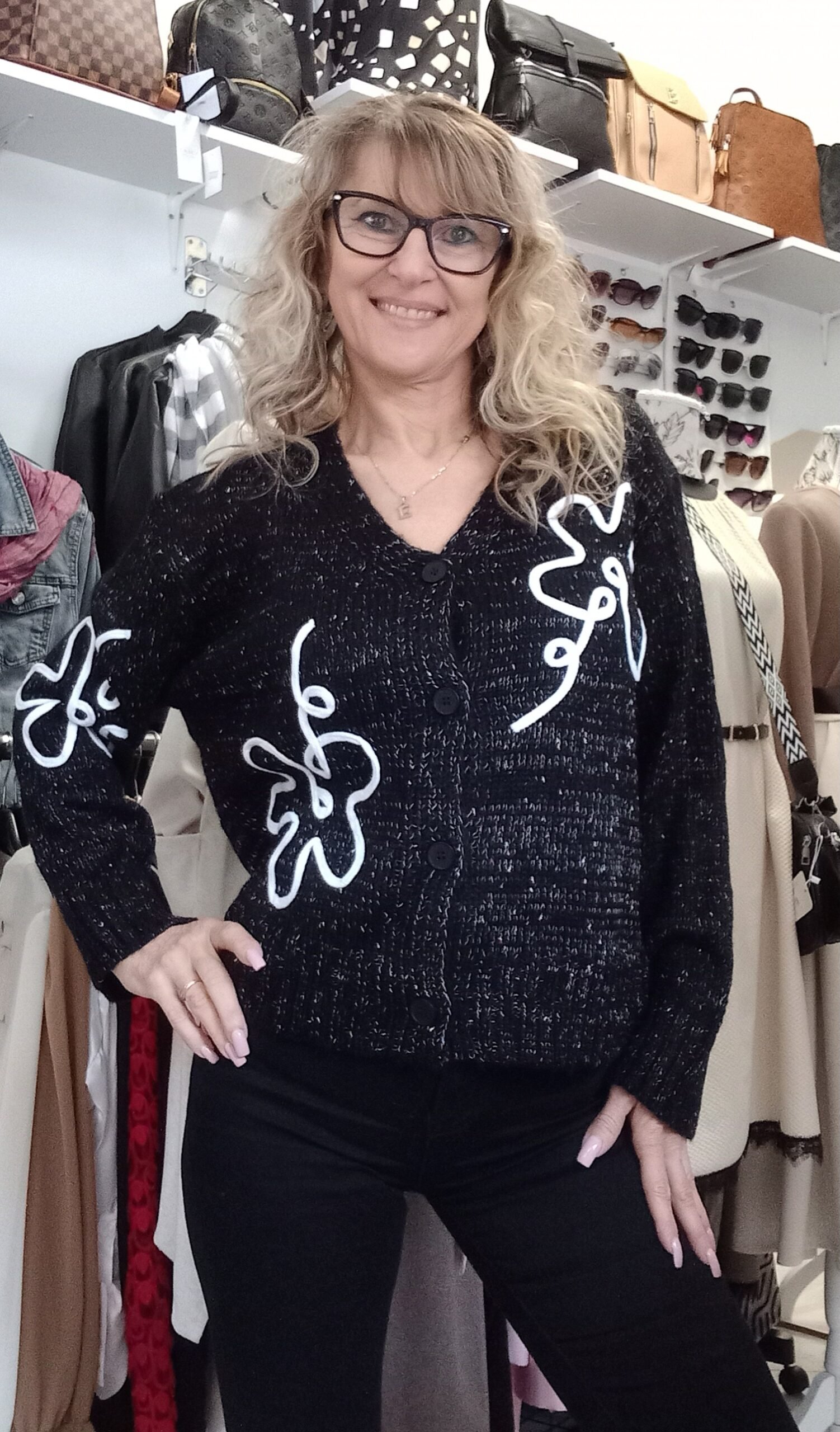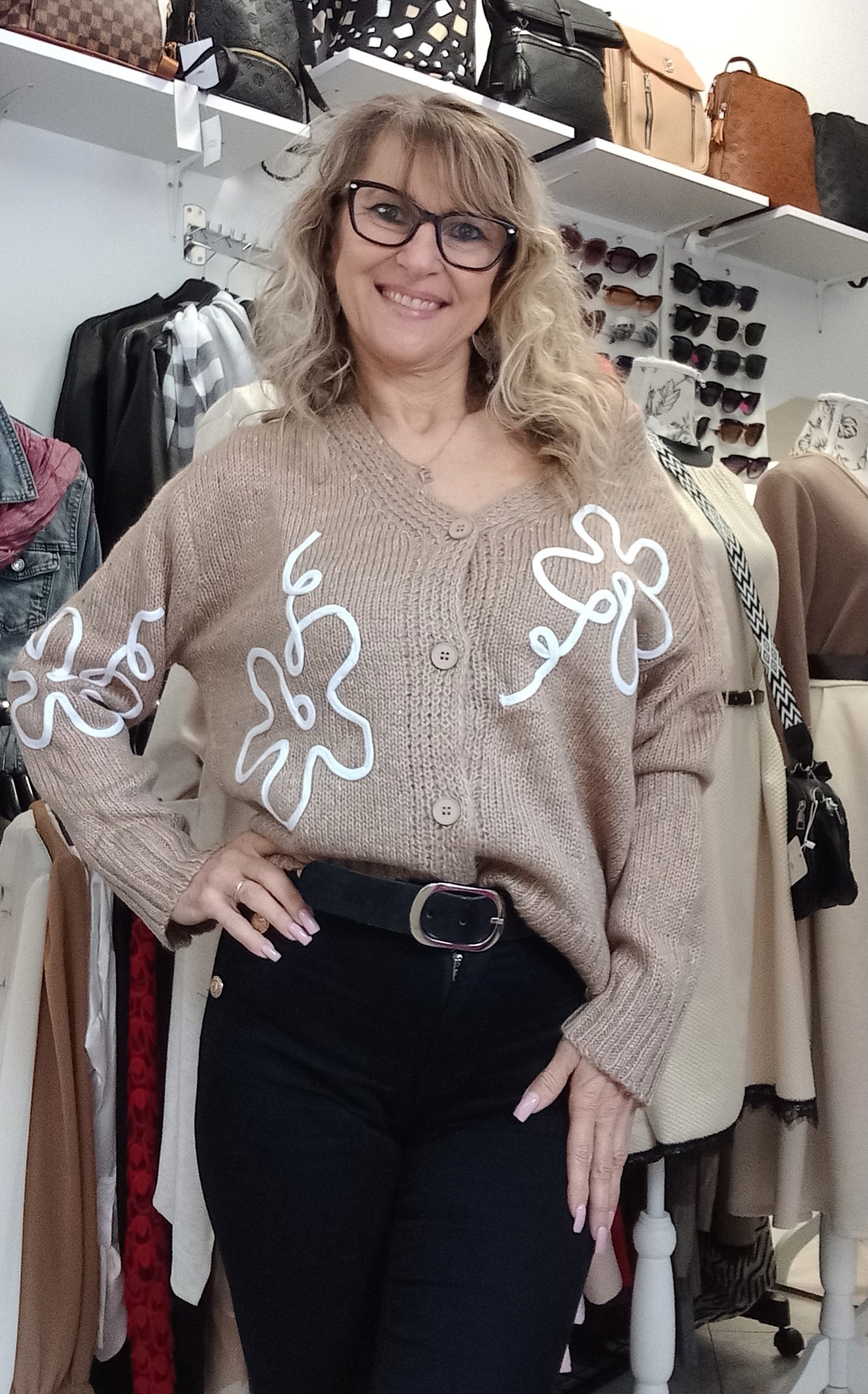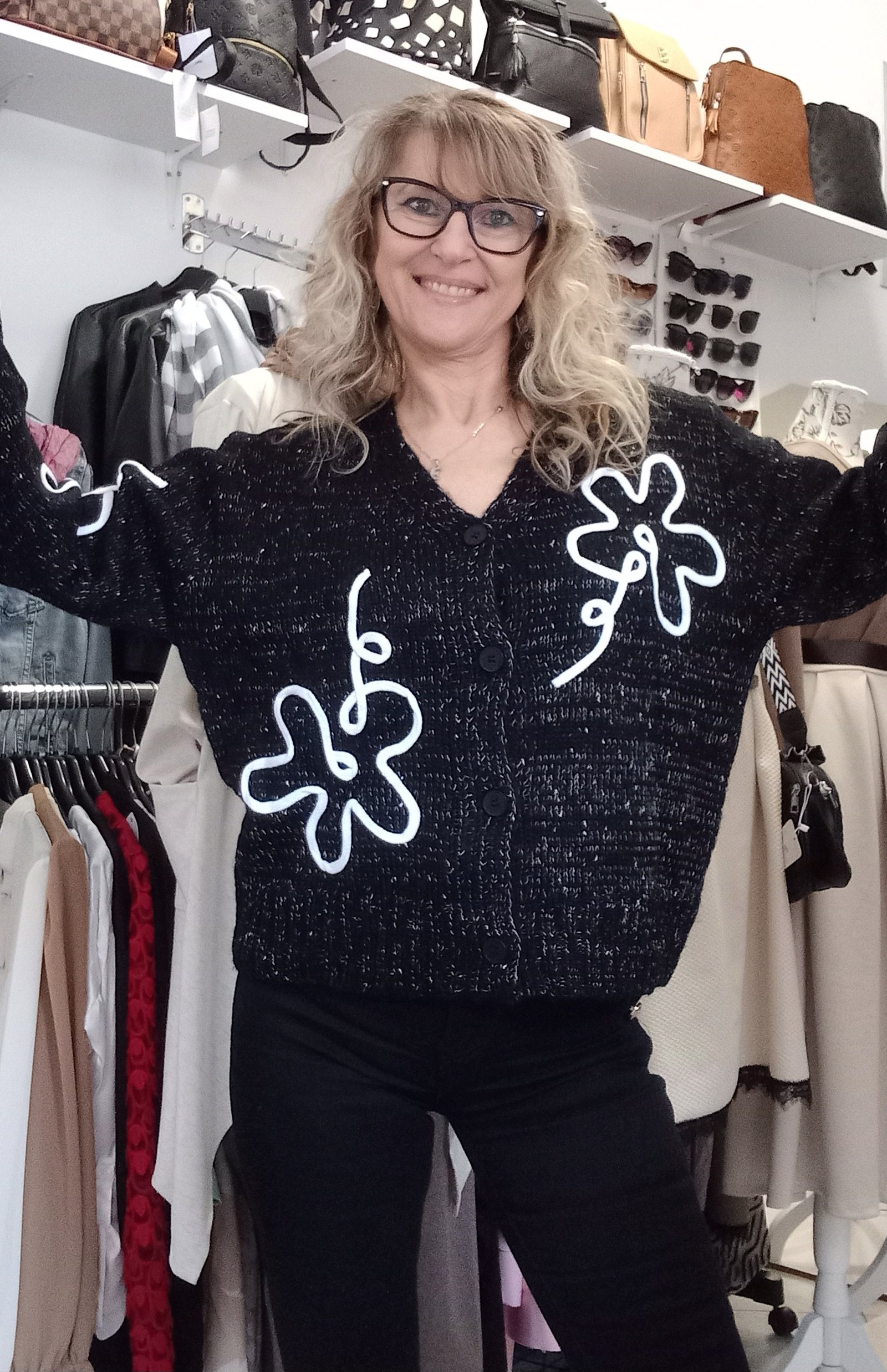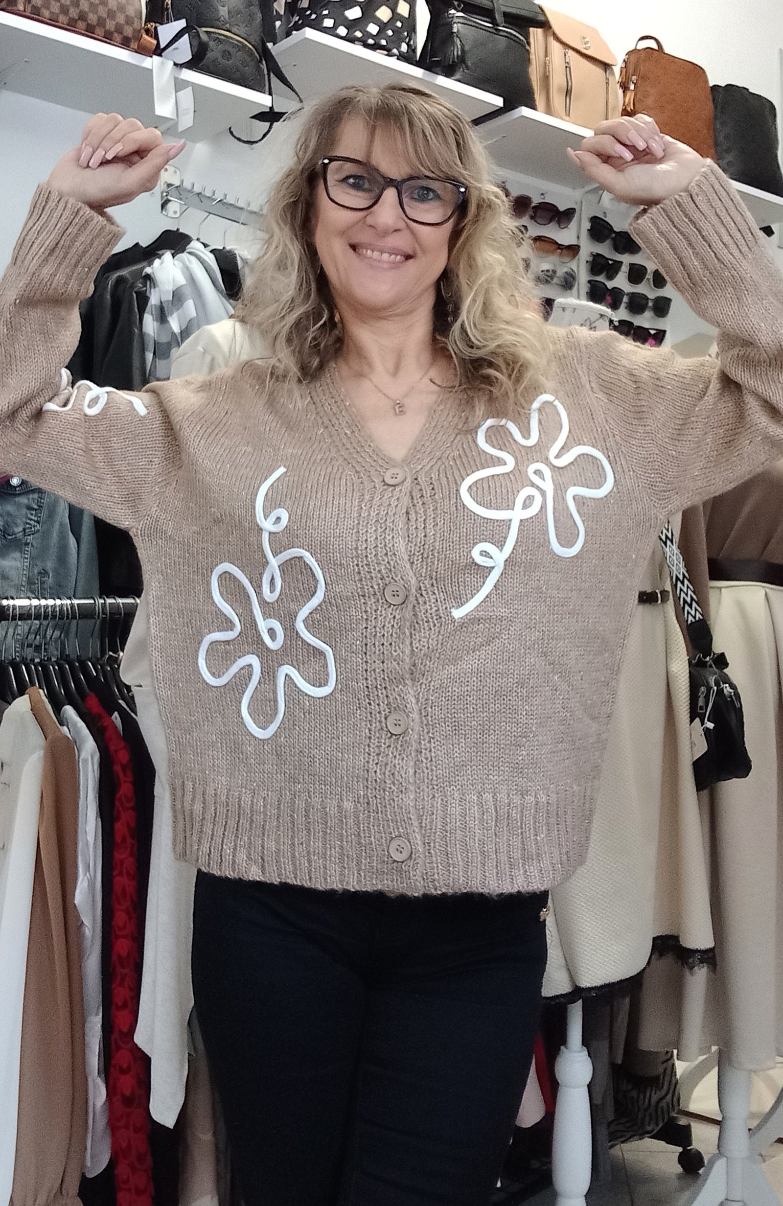 Kötött,gombos kardigán cirmos hatású fonalból, virág applikációval. Méret nélküli, S- XL-ig ajánljuk. A modell S méretű.