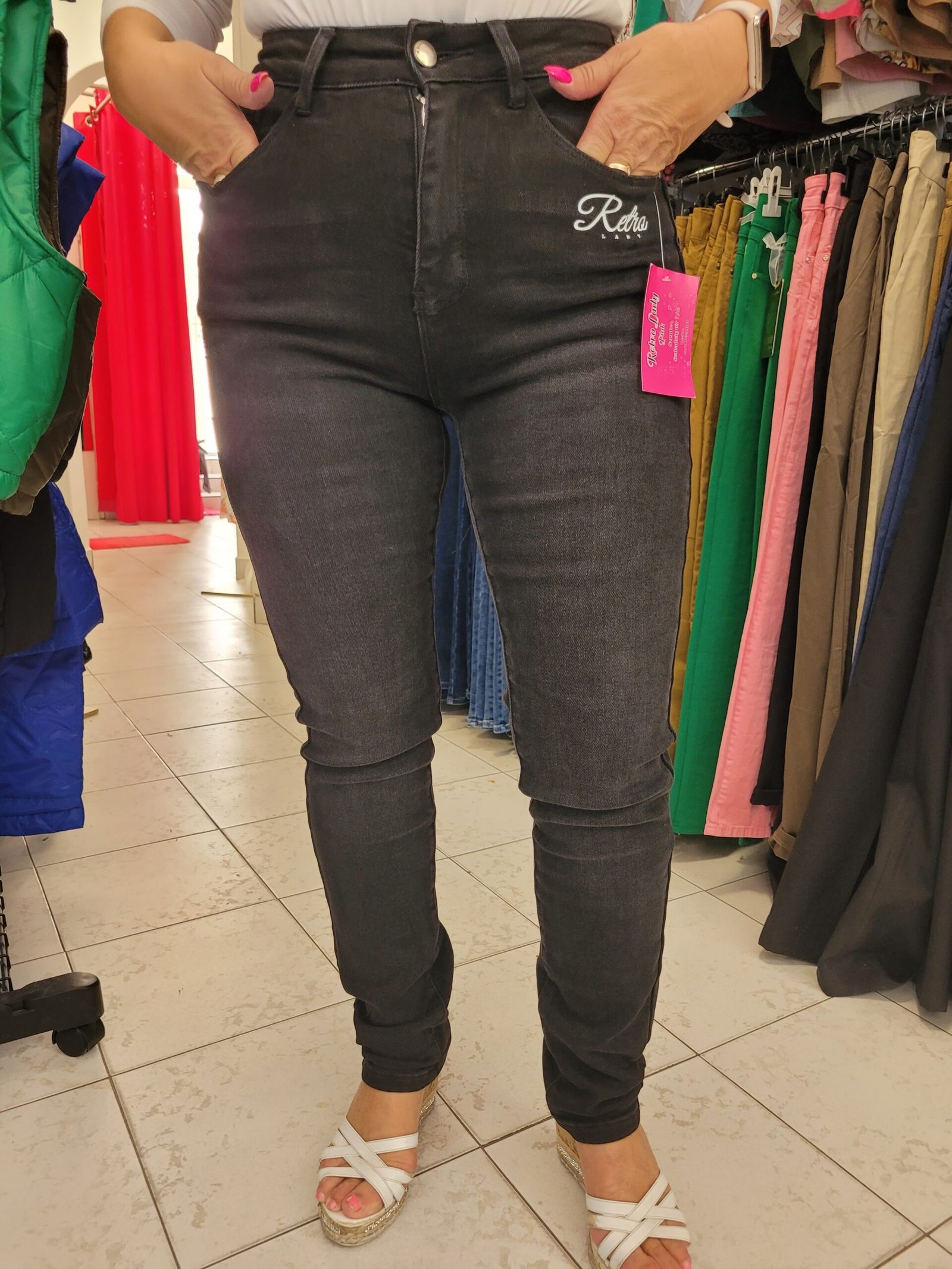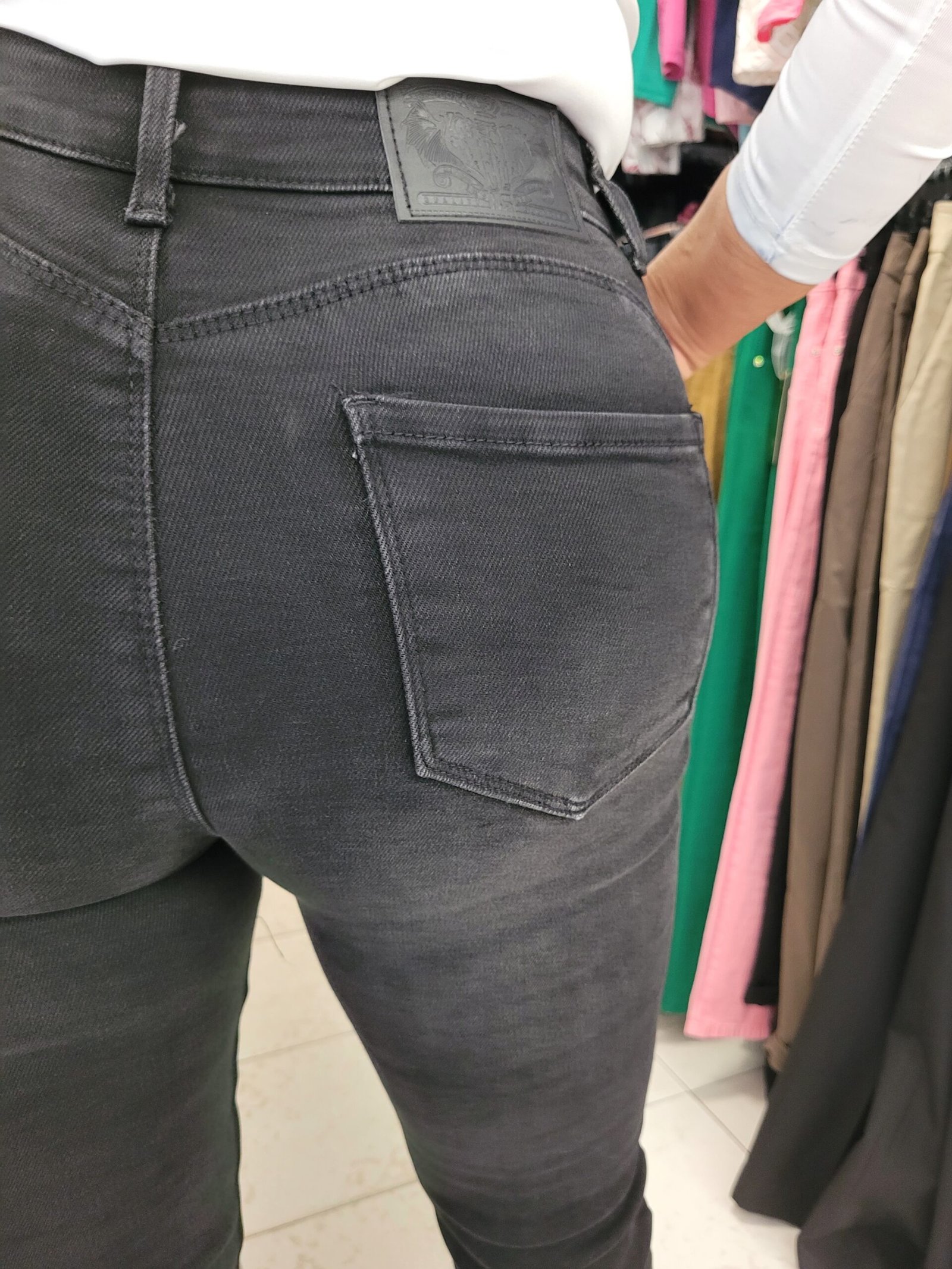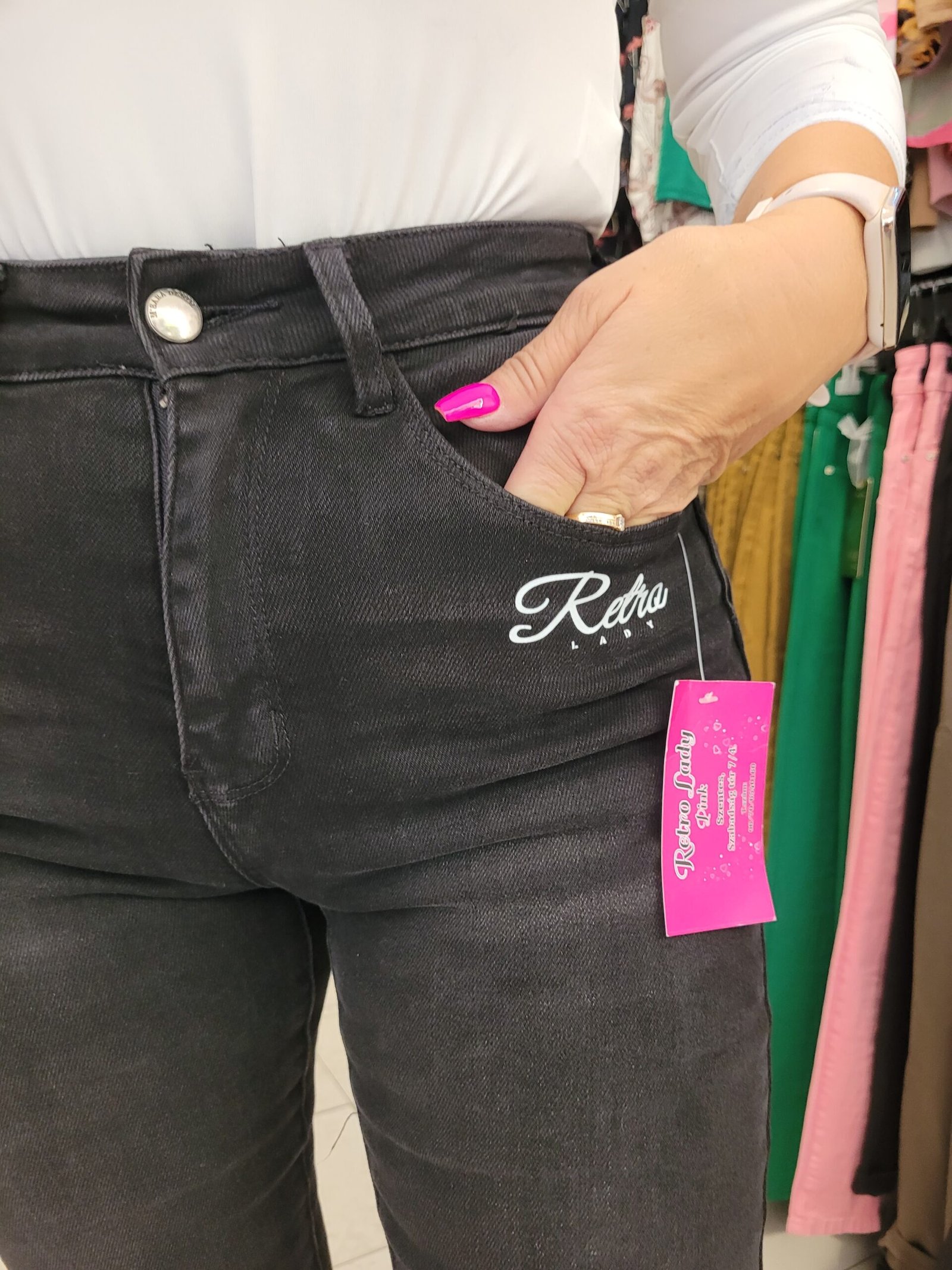 Enyhén koptatott fekete farmer,normál-magas derékkal,egyenes szárral.Rugalmas anyagú. A modell S-est visel.