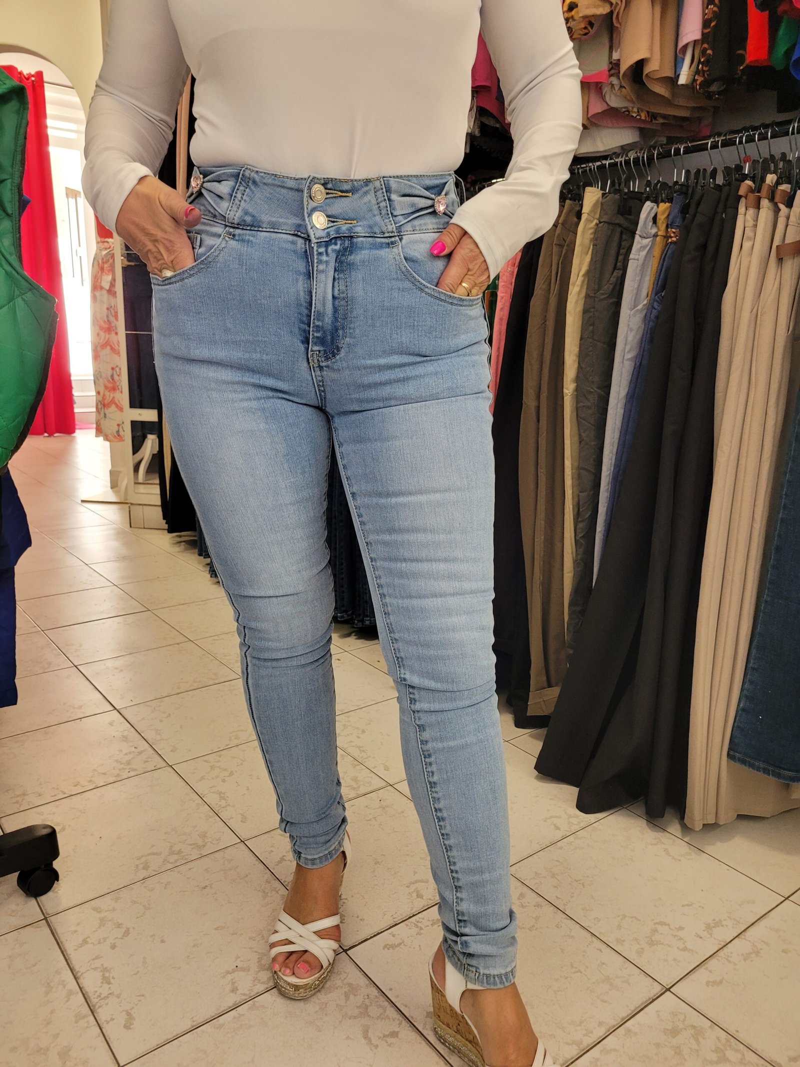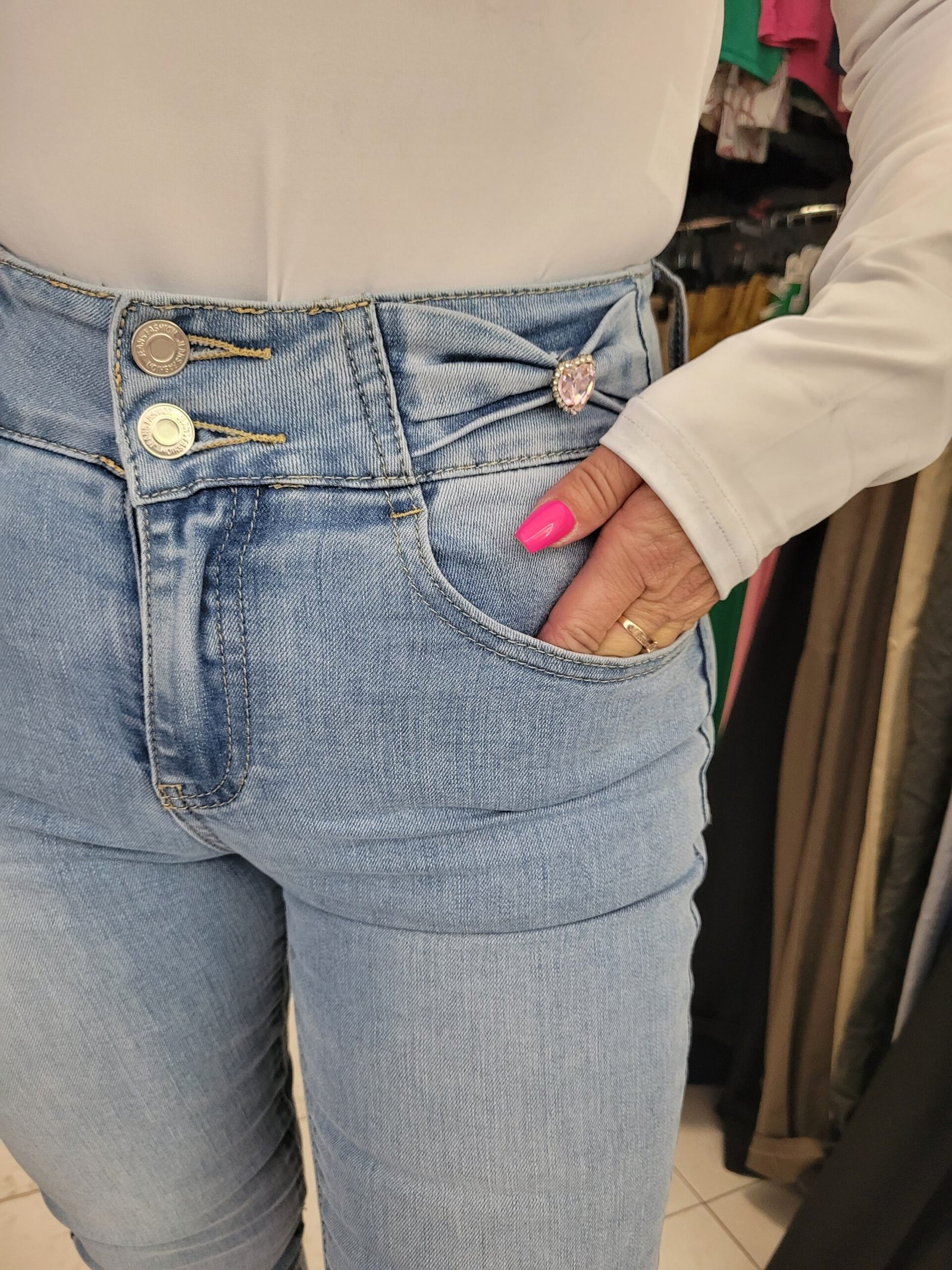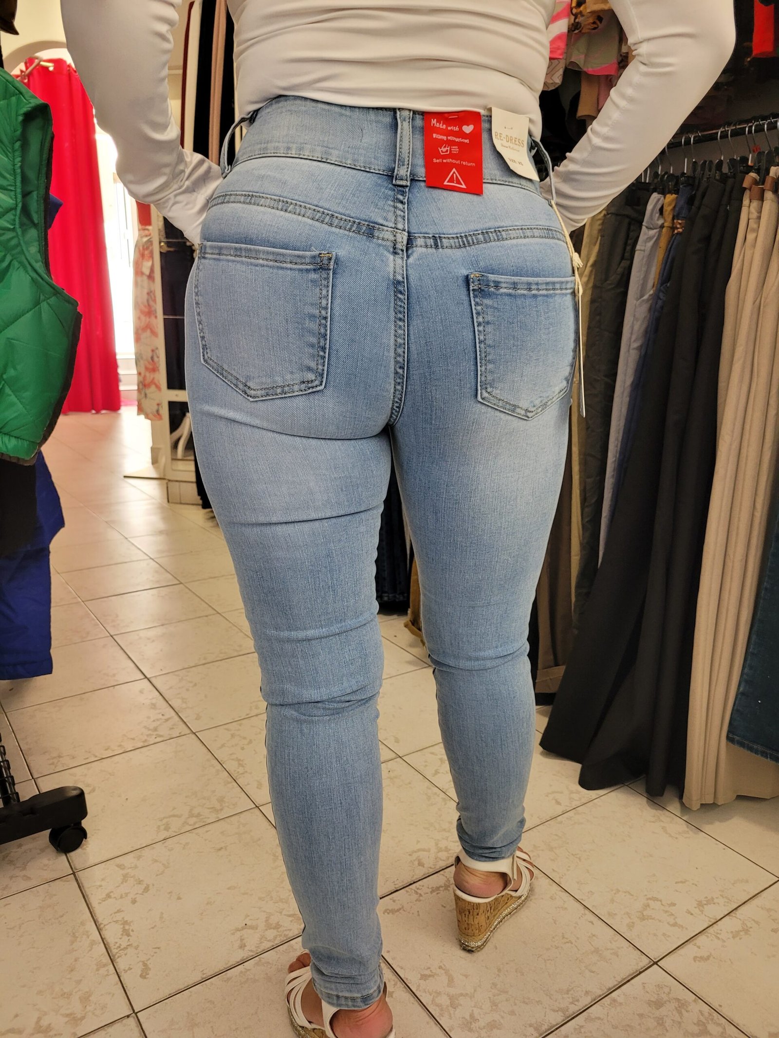 Enyhén magas derekú,világos kék farmer,derekán masnival és kővel.Rugalmas anyagú. A modell S-est visel.