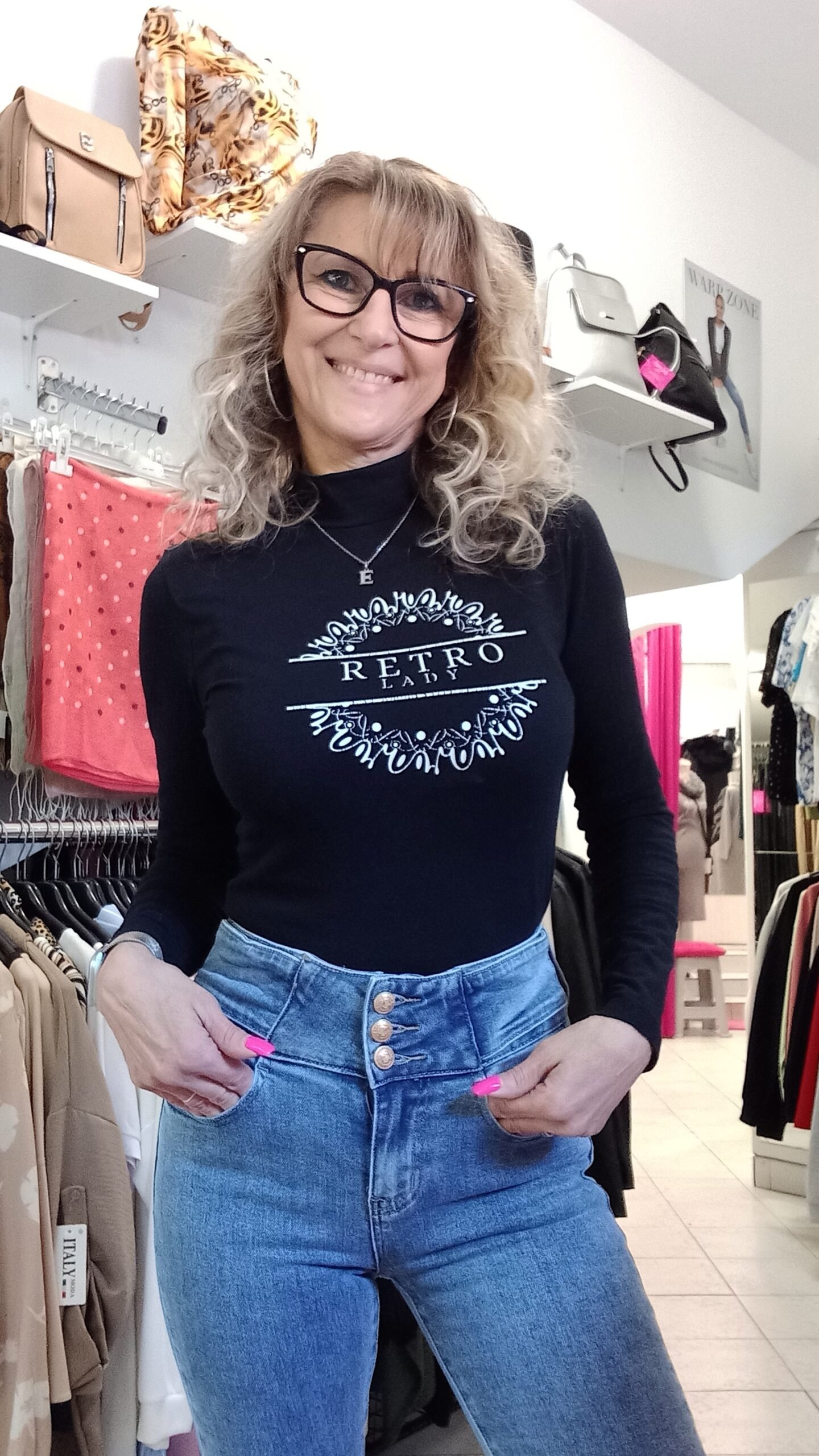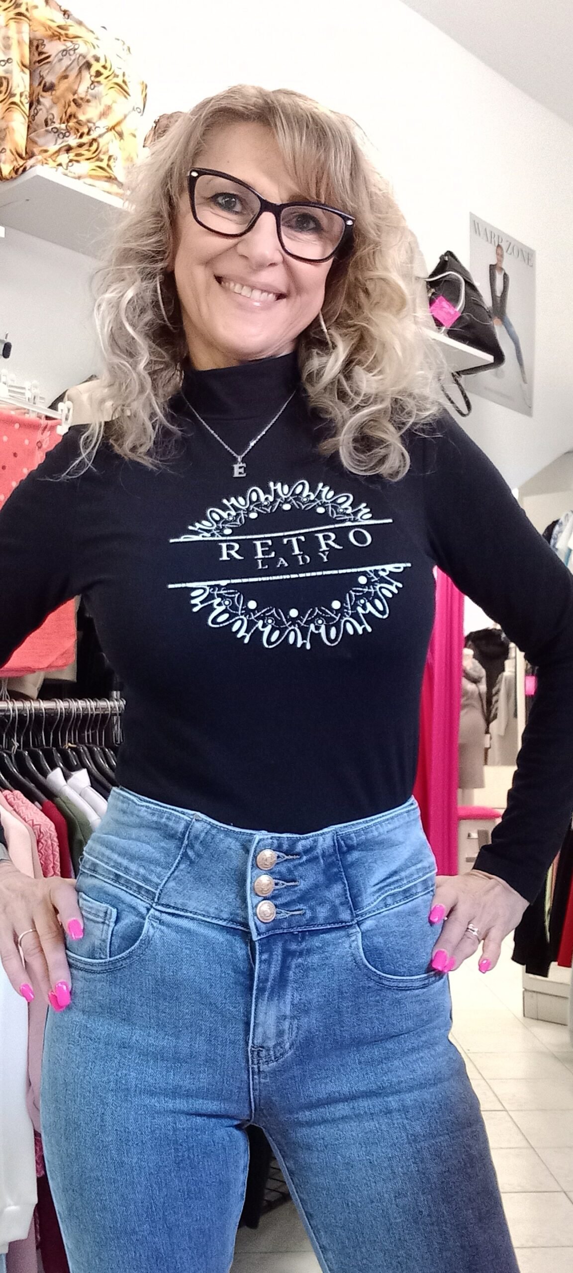 Rugalmas,magas derekú,három gombos farmer.