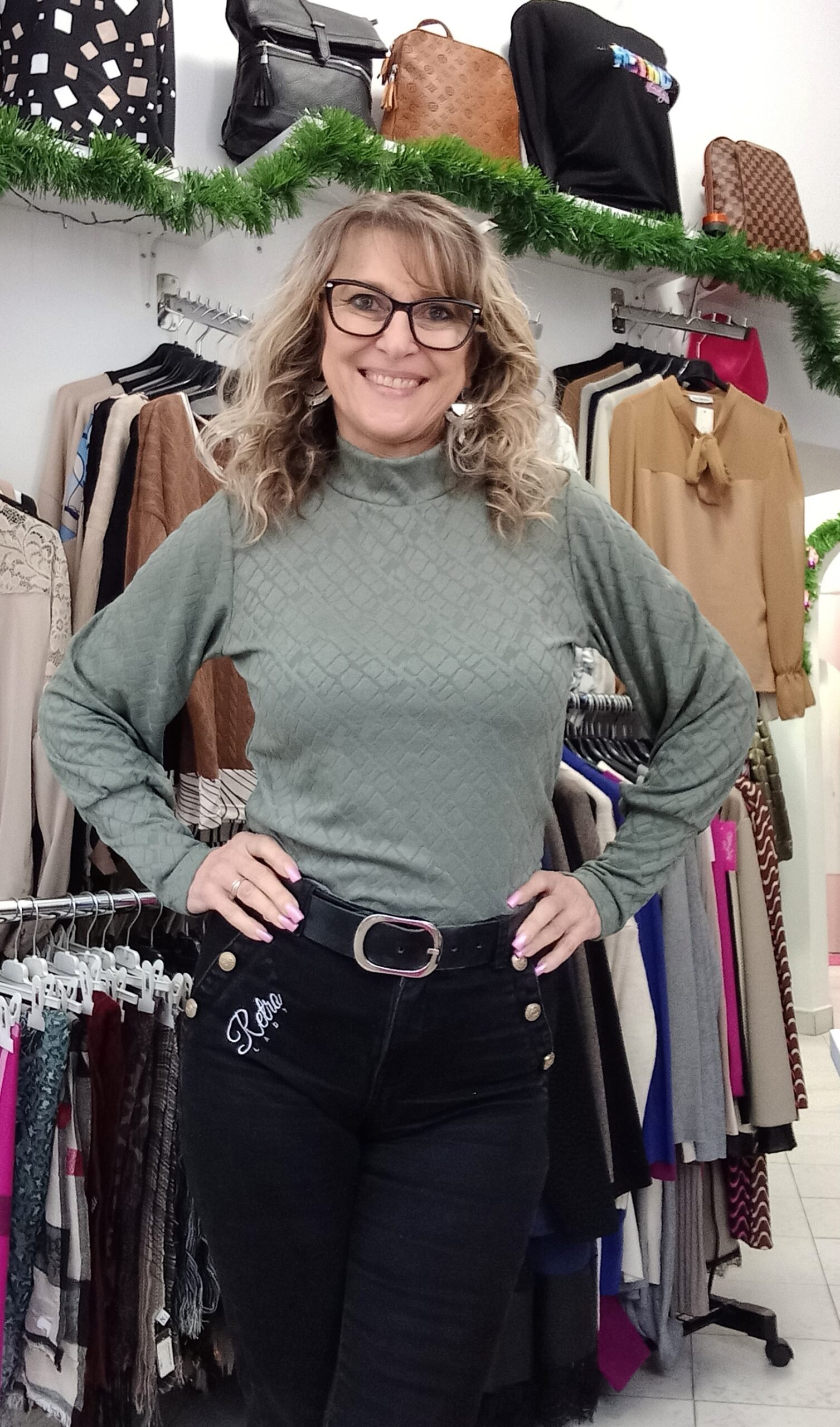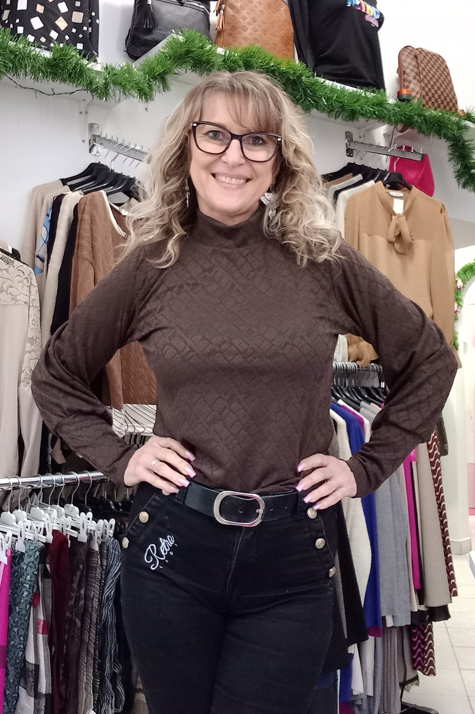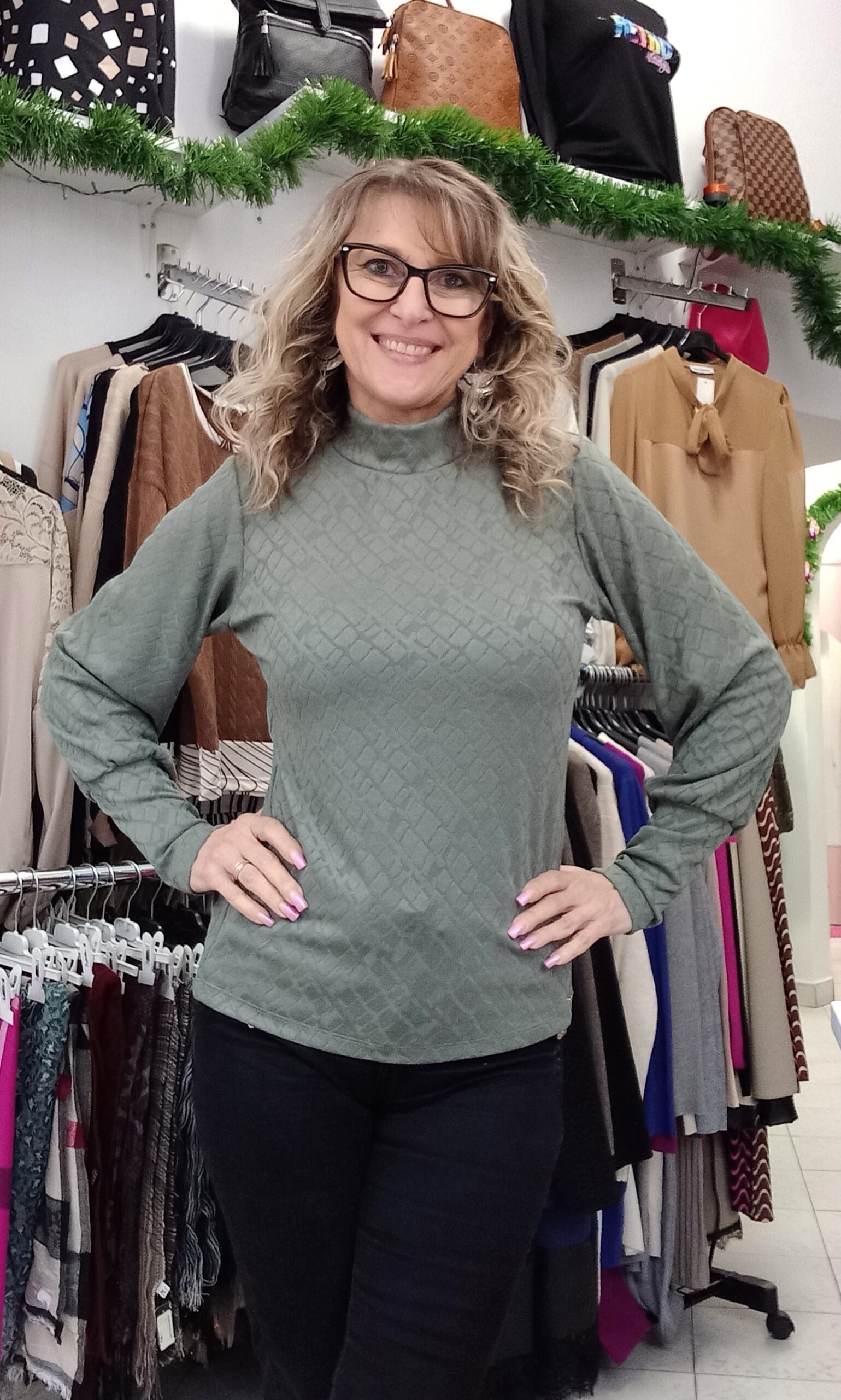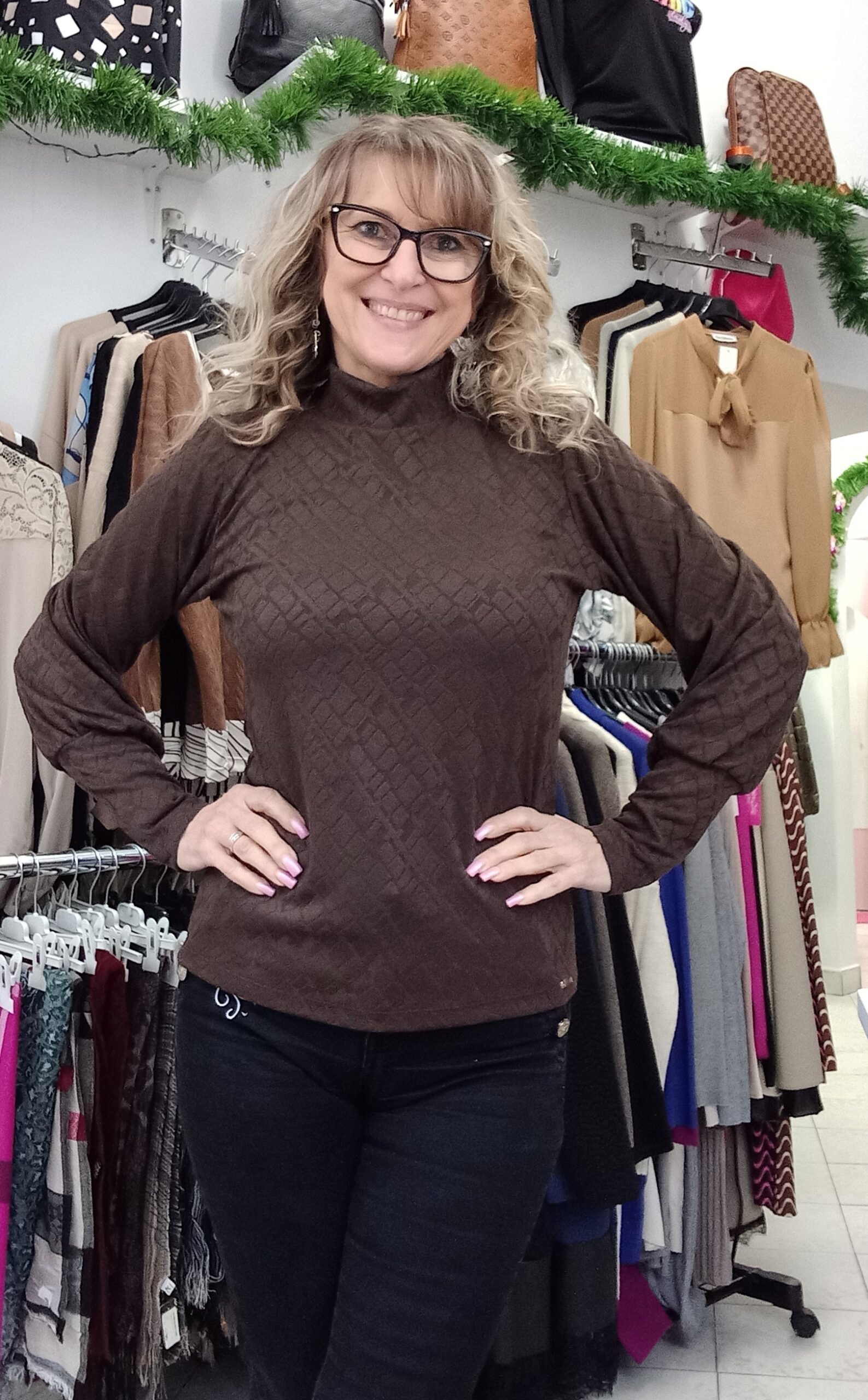 Nyomott mintás, rugalmas anyagú felső különleges passzéval az ujján. Méret nélküli, S- kis L-ig jó. A modell S méretű.