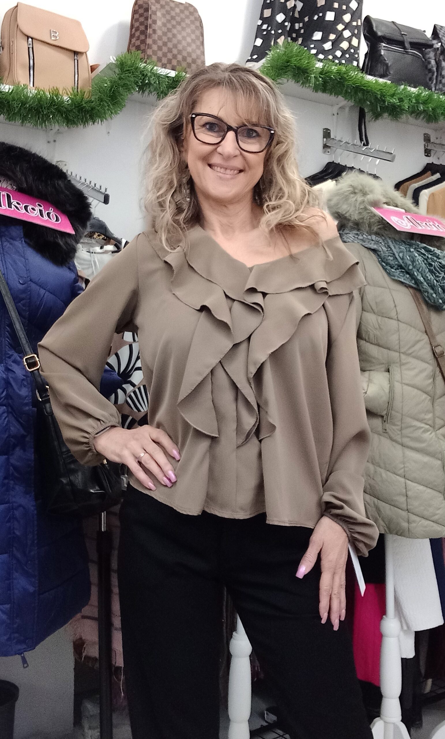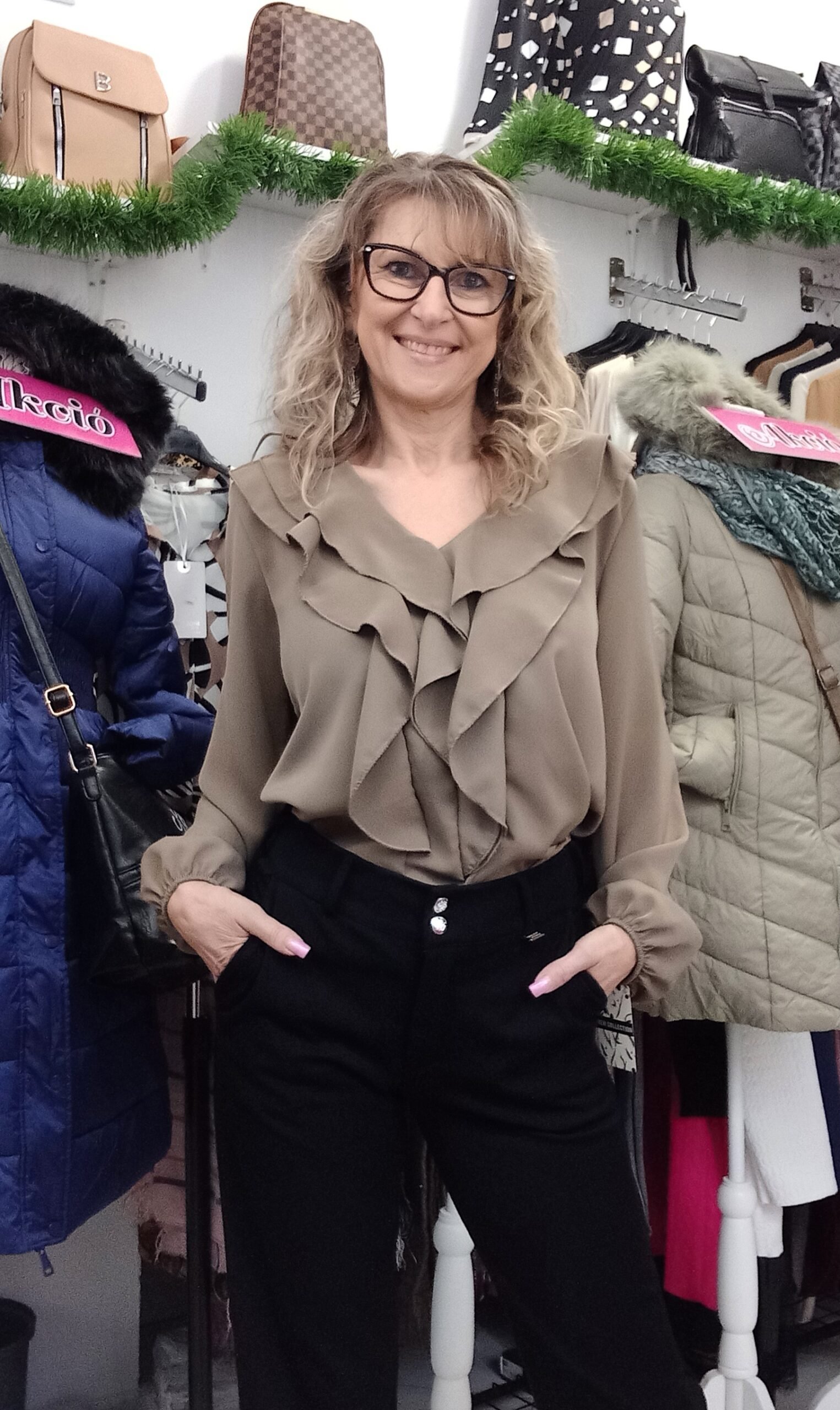Selymes hatású anyagú felső, V kivágású,elöl fodor díszítéssel. Méret nélküli, S- L-ig tökéletes. A modell S méretű.