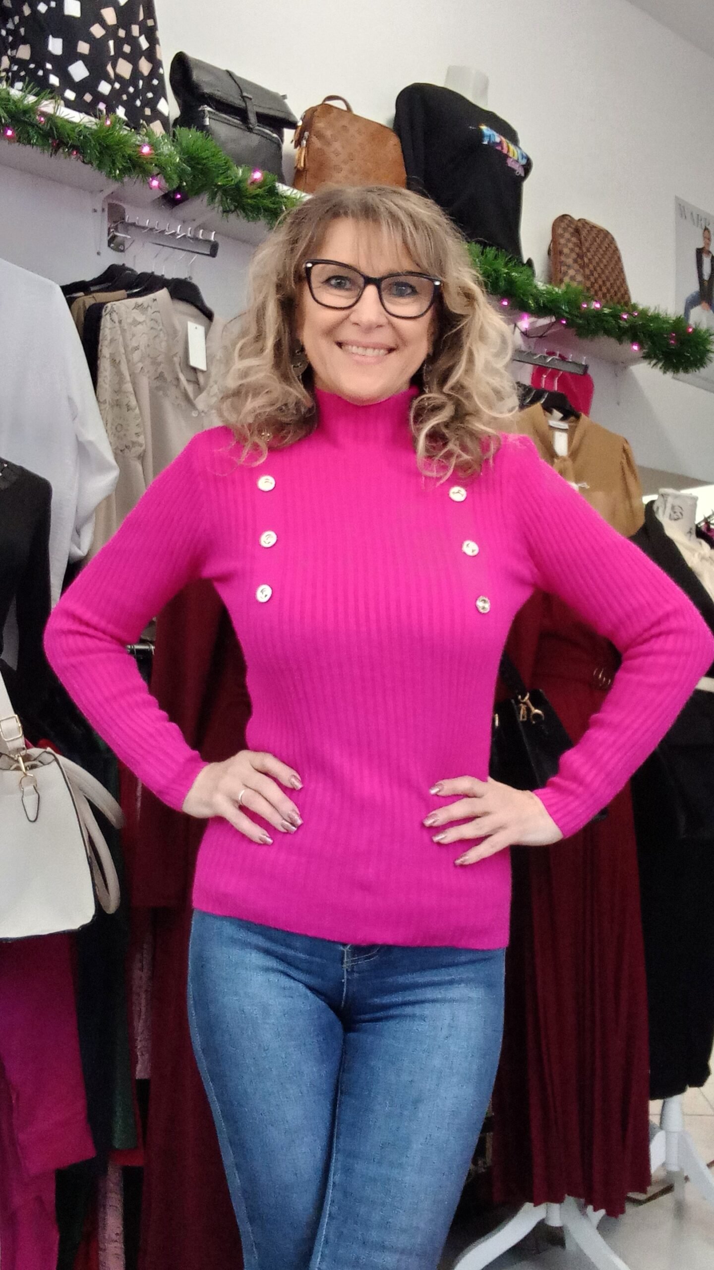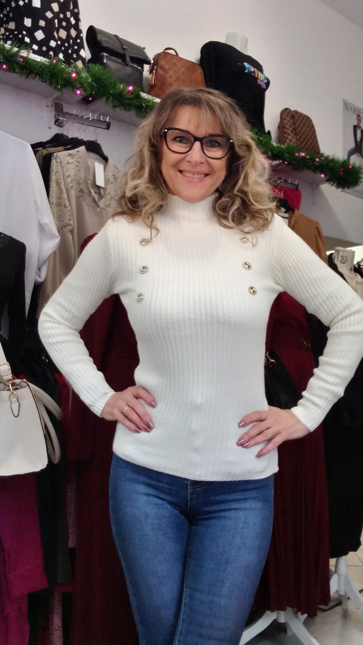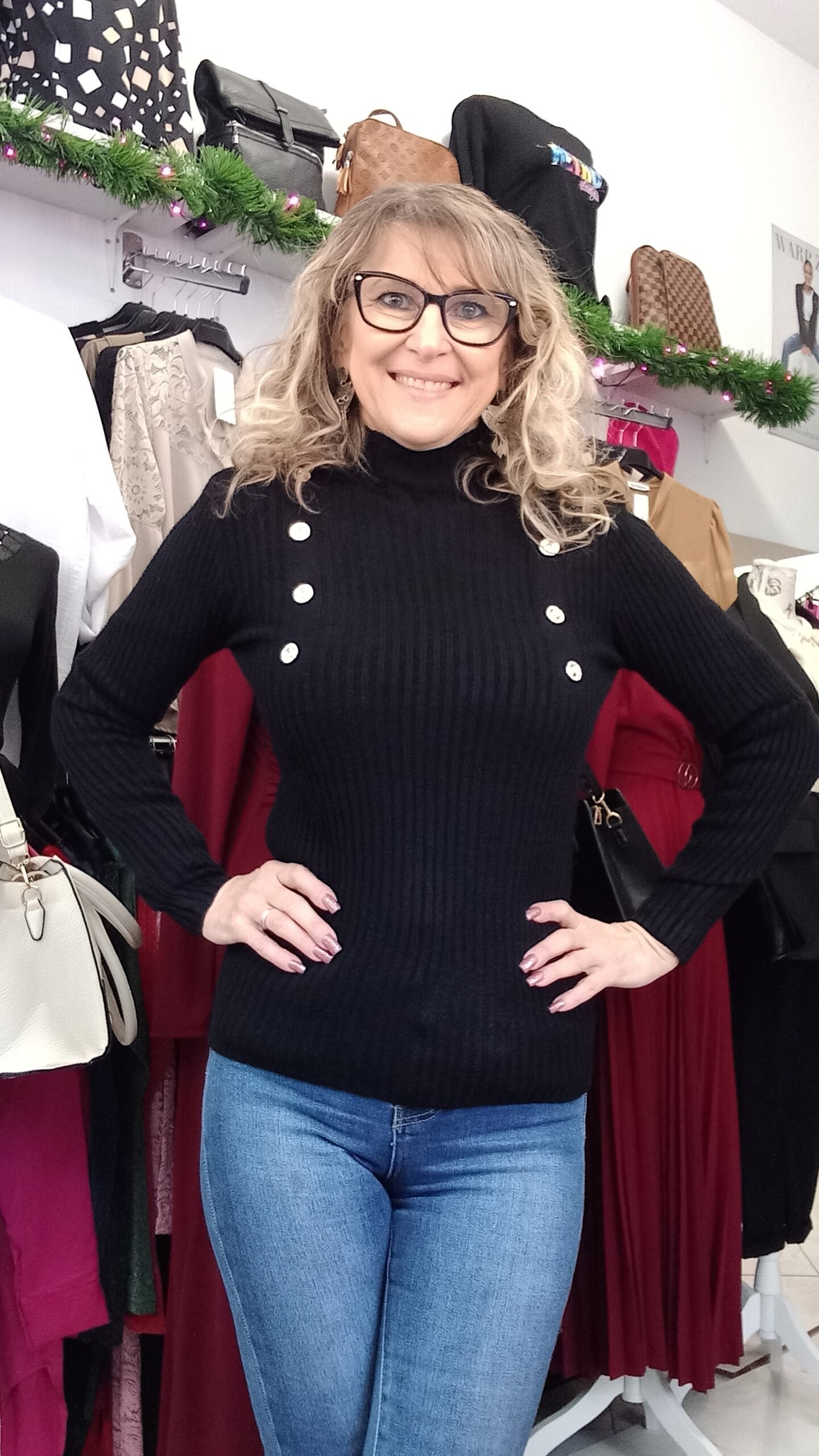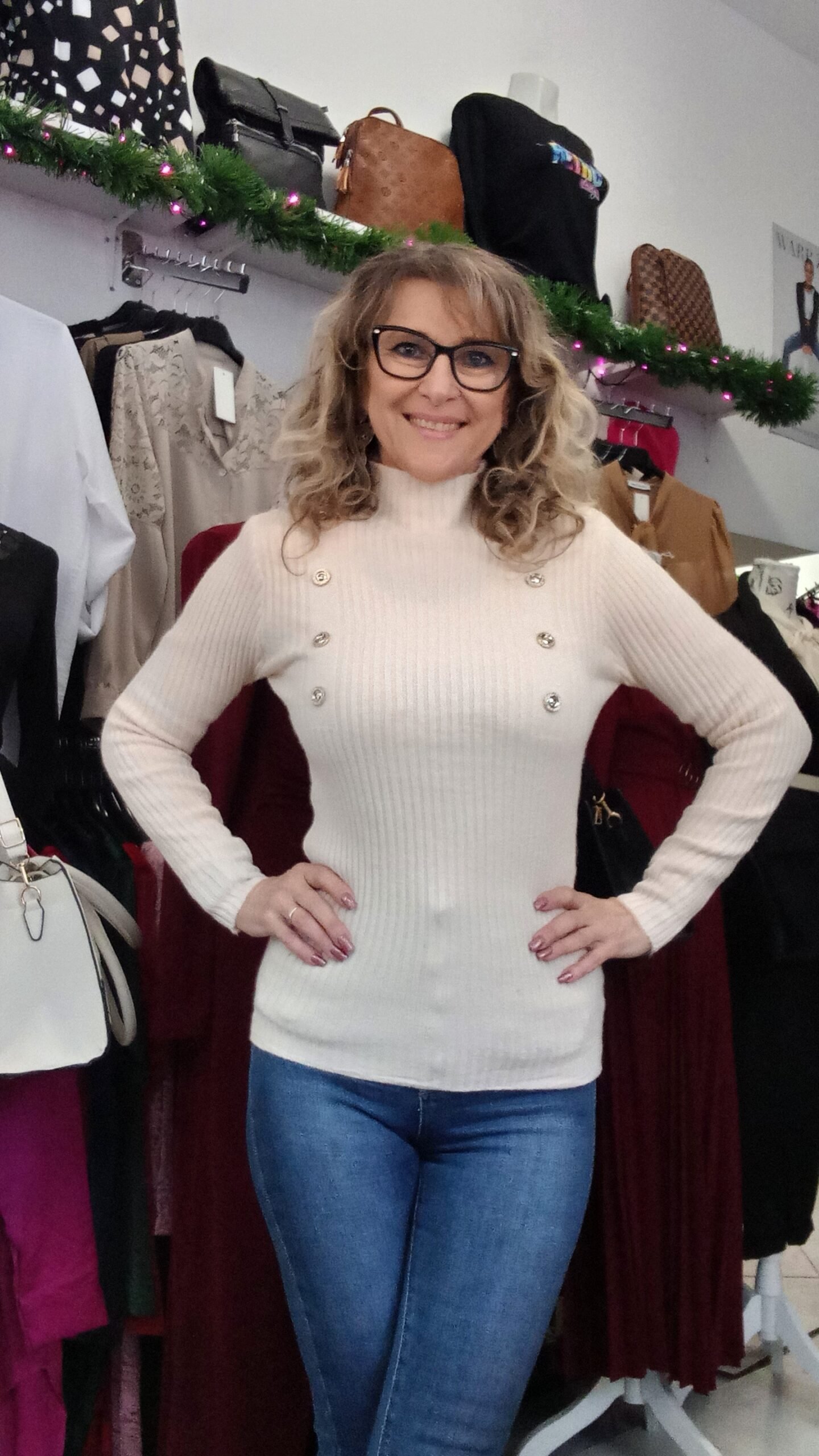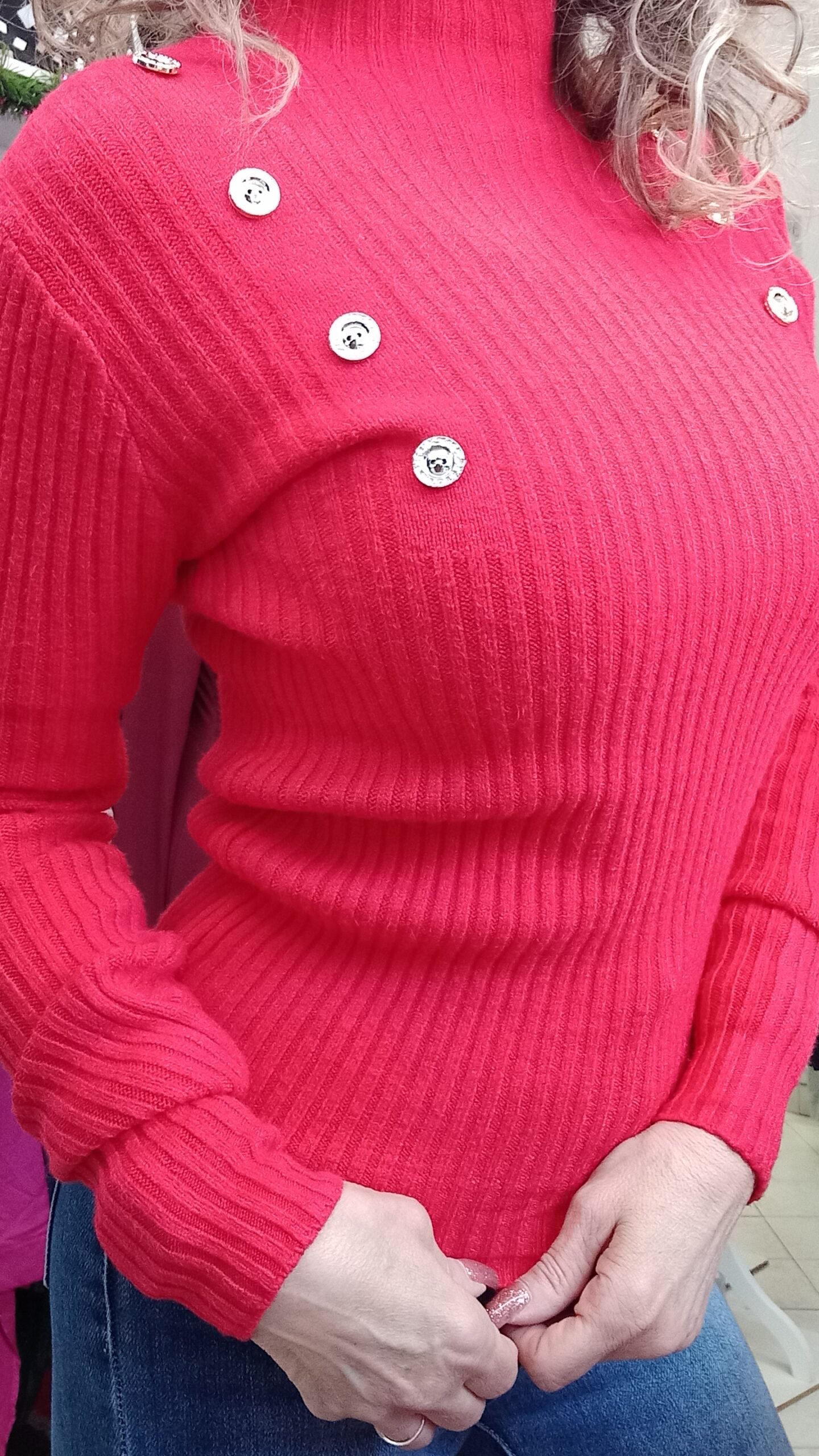 Bordásan kötött pulóver gomb díszítéssel. S-kis XL-ig jó. 1-es méret S-M, 2-es méret L-XL. A modell S méretű.