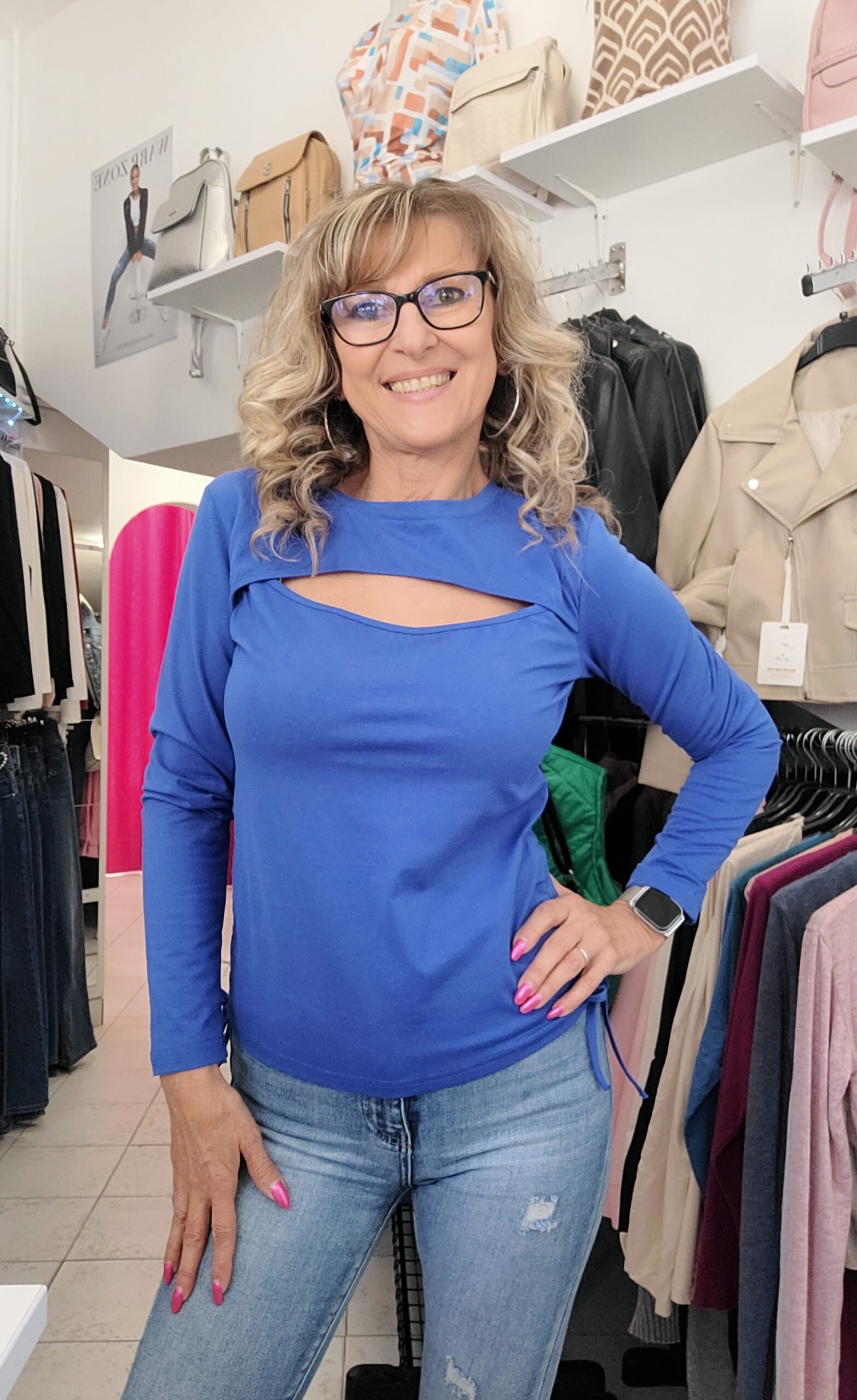 Pamut anyagú,elöl kivágással, oldal zsinórral.A modell S-es méret, S-M méretet visel.