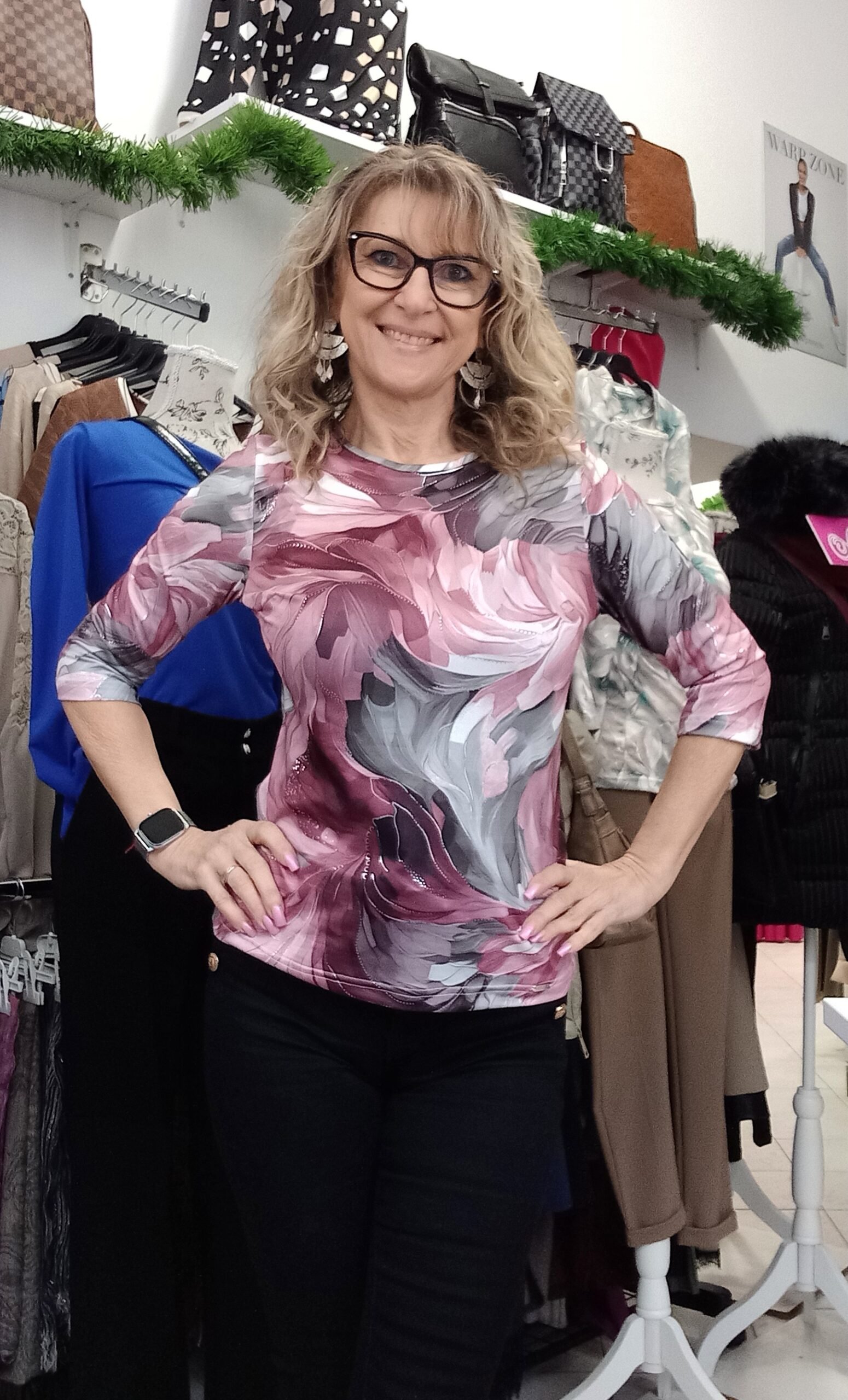 Jégselyem hatású,rugalmas anyagú,3/4-es ujjú felső. Méret nélküli, S-M-re jó. A modell S méretű.