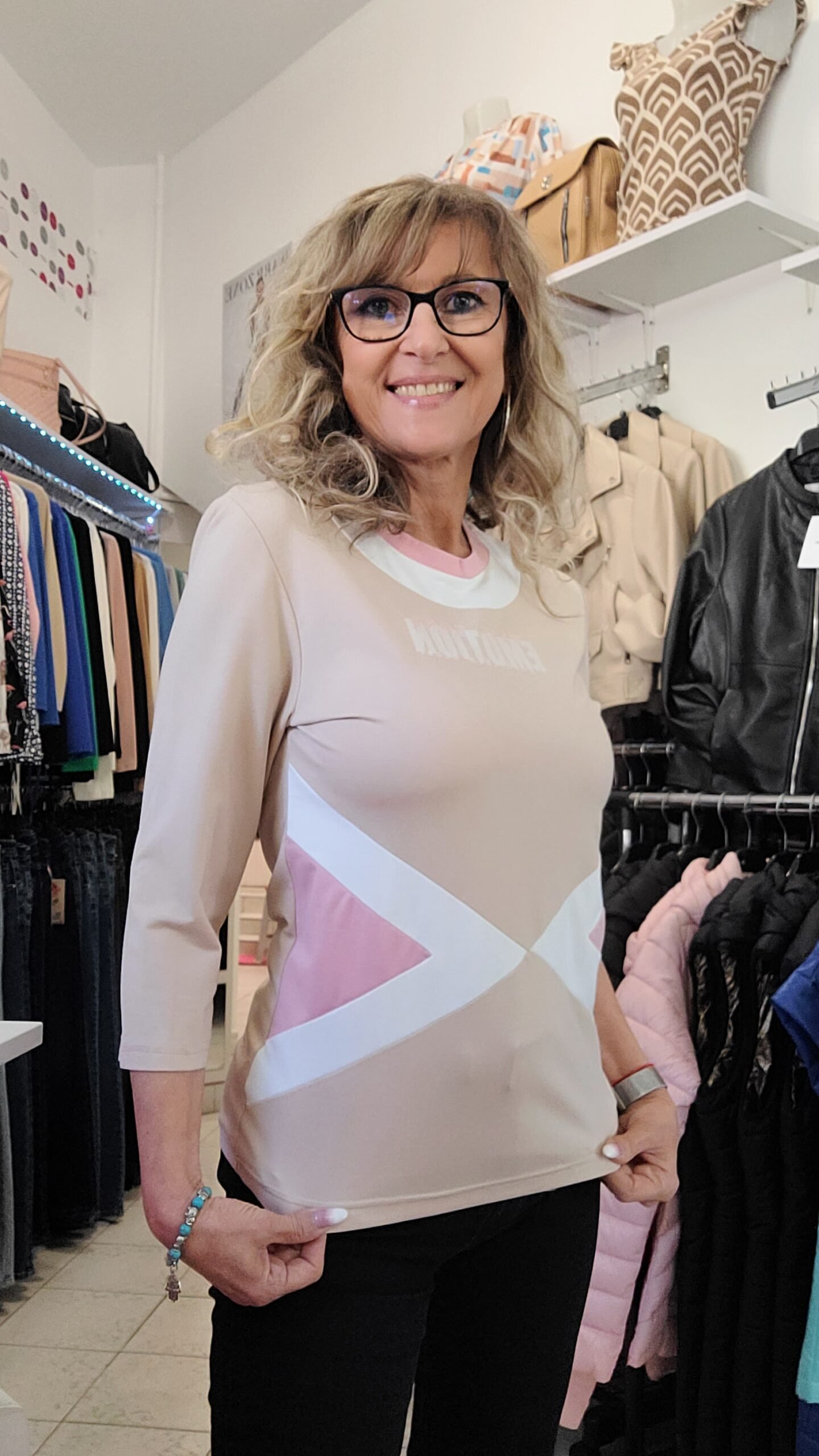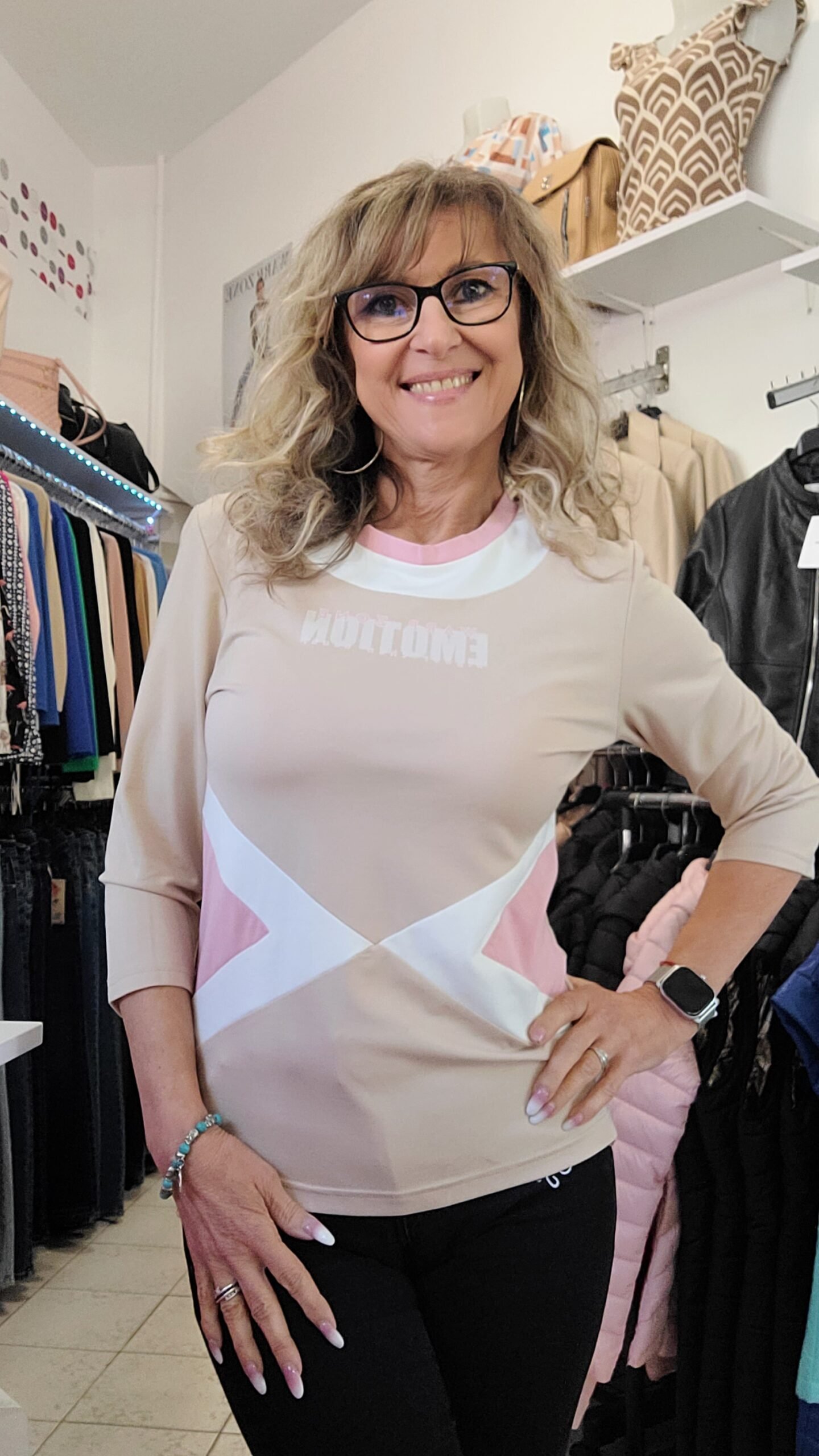 Pamut hatású anyagú, 3/4-es ujjú felső, oldalán más színű betéttel,elején felirattal.Méret nélküli, S-M-re ajánljuk.