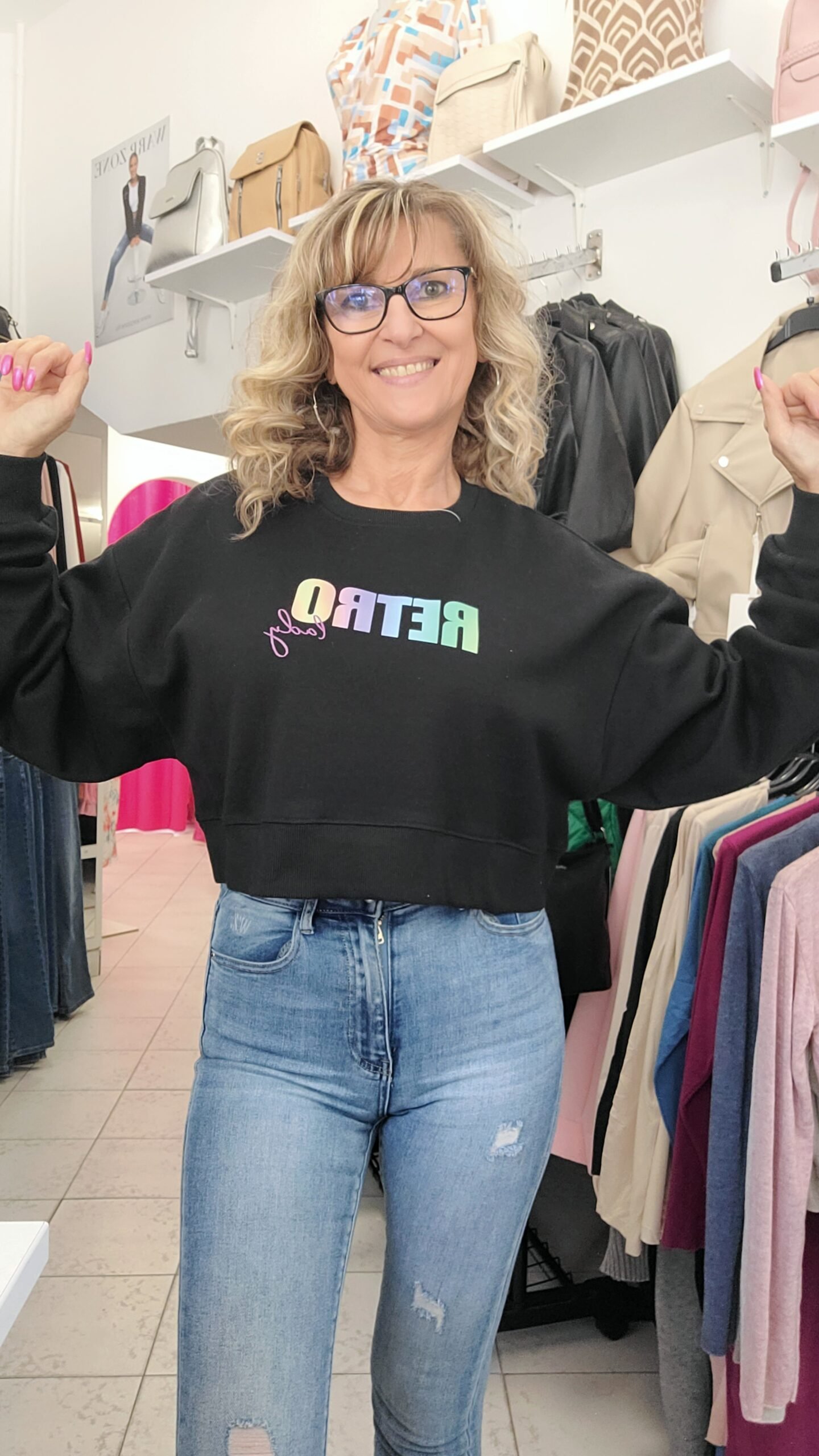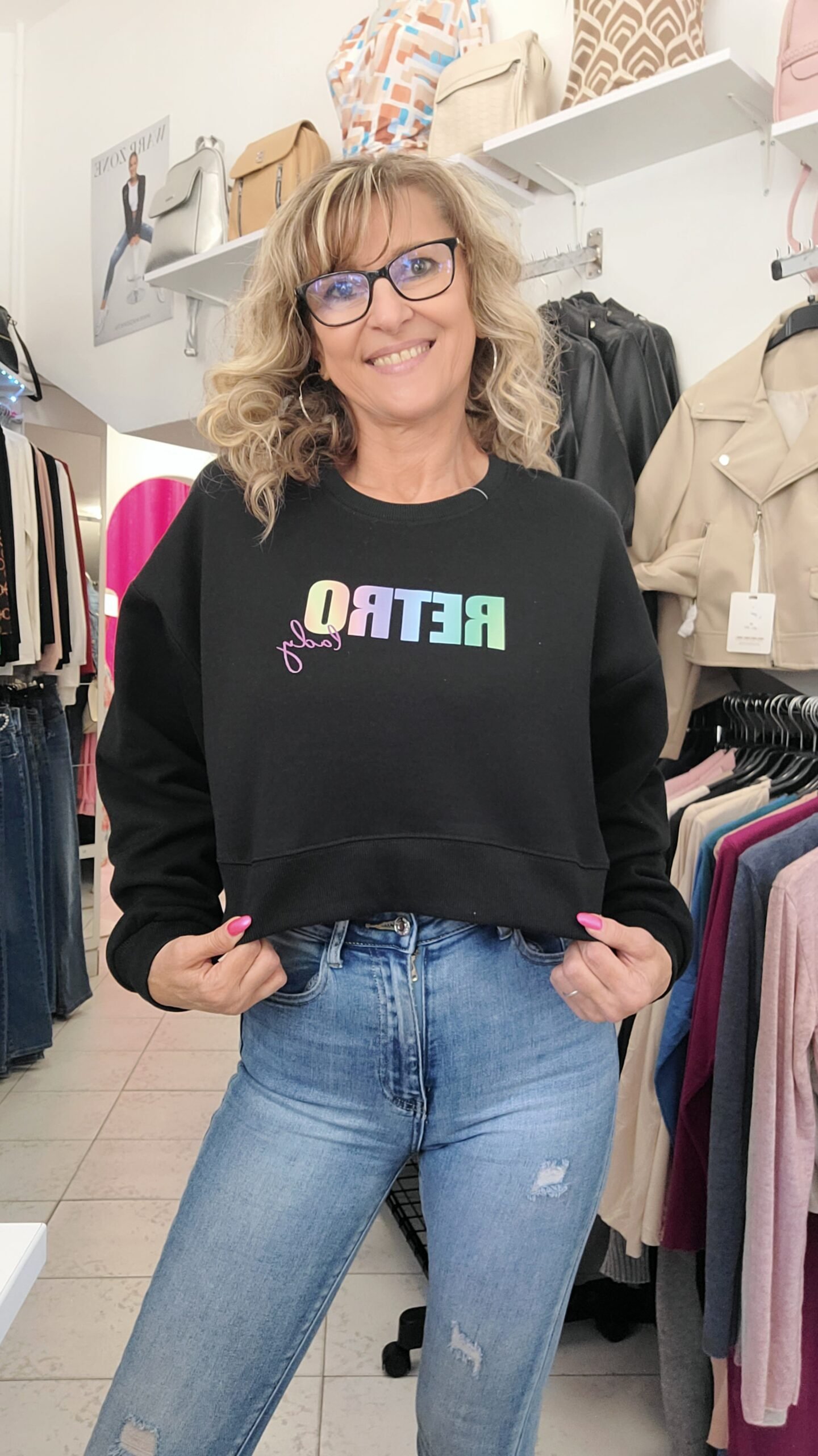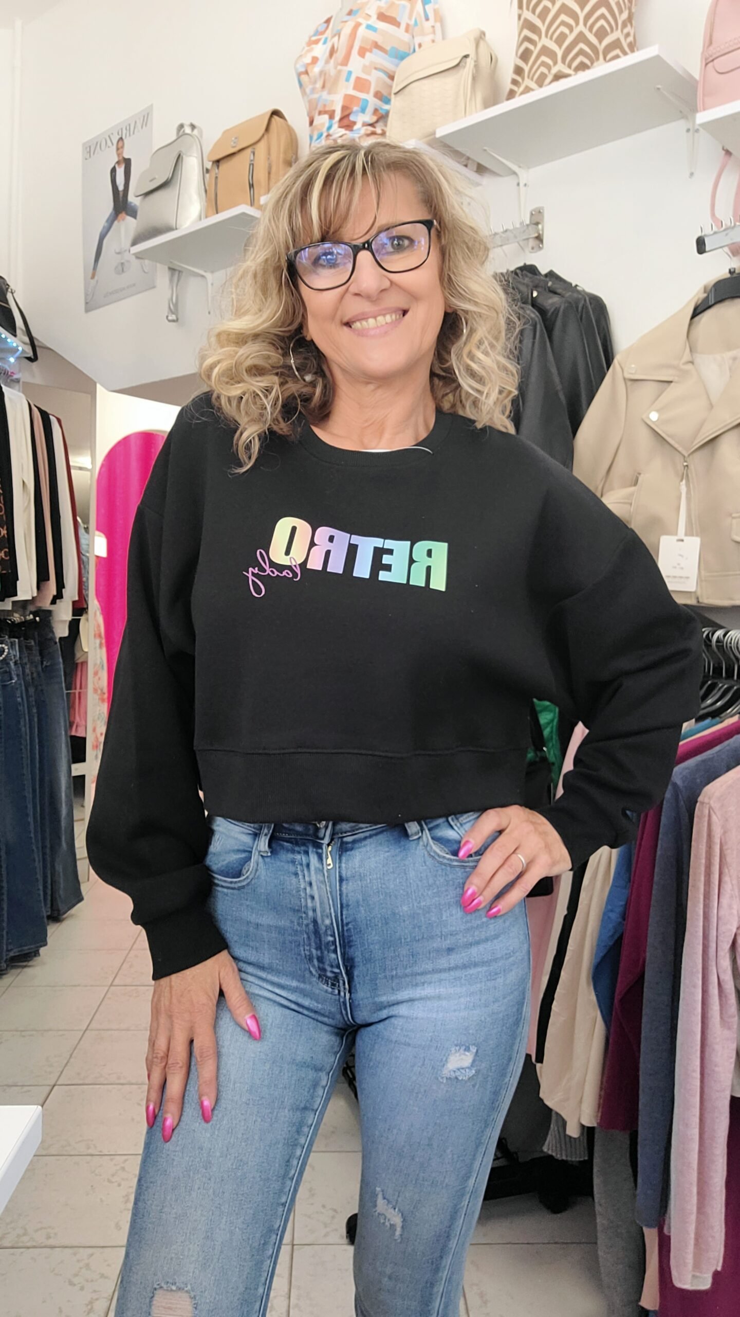 Pamutos,bolyhos belsejű crop felső,oversize fazonú.S-L-ig ajánljuk. A modell S-es méretű.