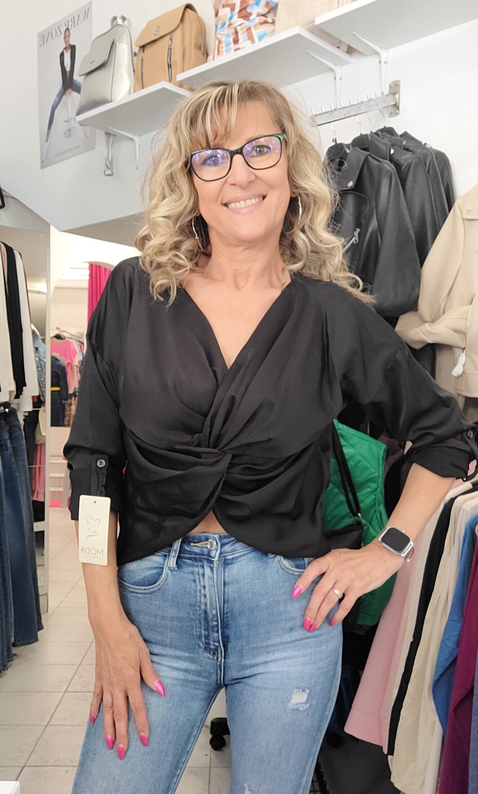 Szatén anyagú felső,elöl rövidebb,csavart fazonú.Ujja felgombolható, V nyakú. Méret nélküli, nem rugalmas, S-M-re jó.