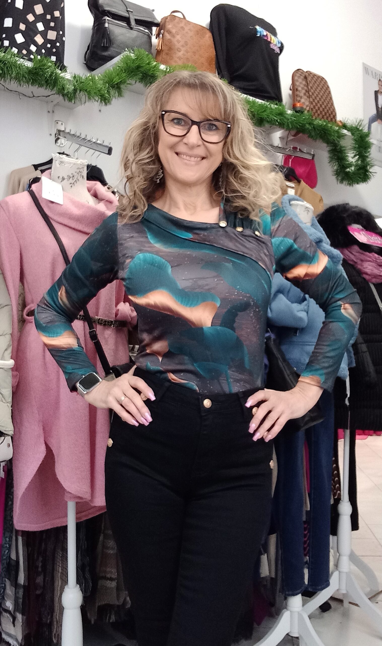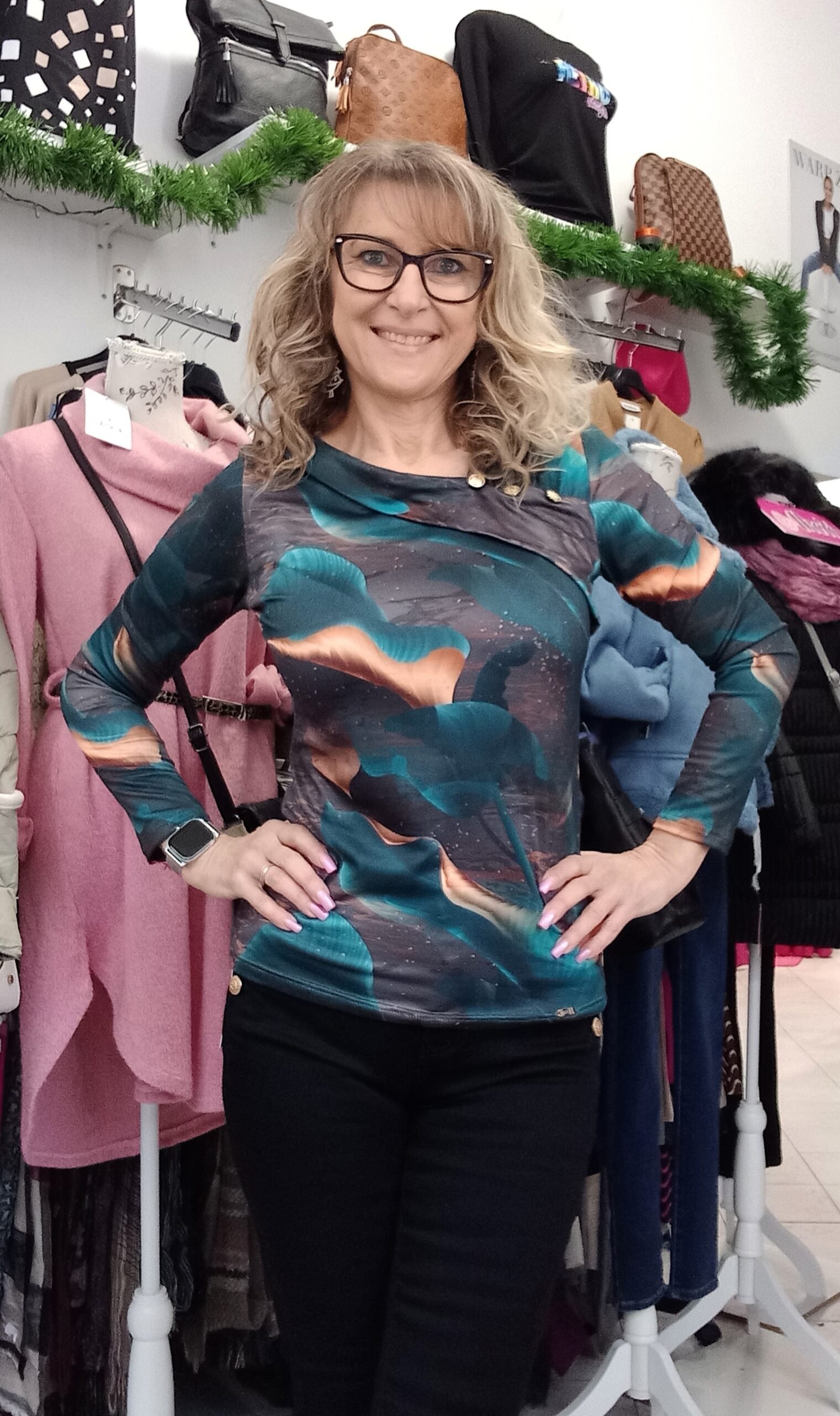 Jégselyem hatású, rugalmas anyagú, mintás felső aszimmetrikus nyakkal, arany színű gomb díszítéssel.