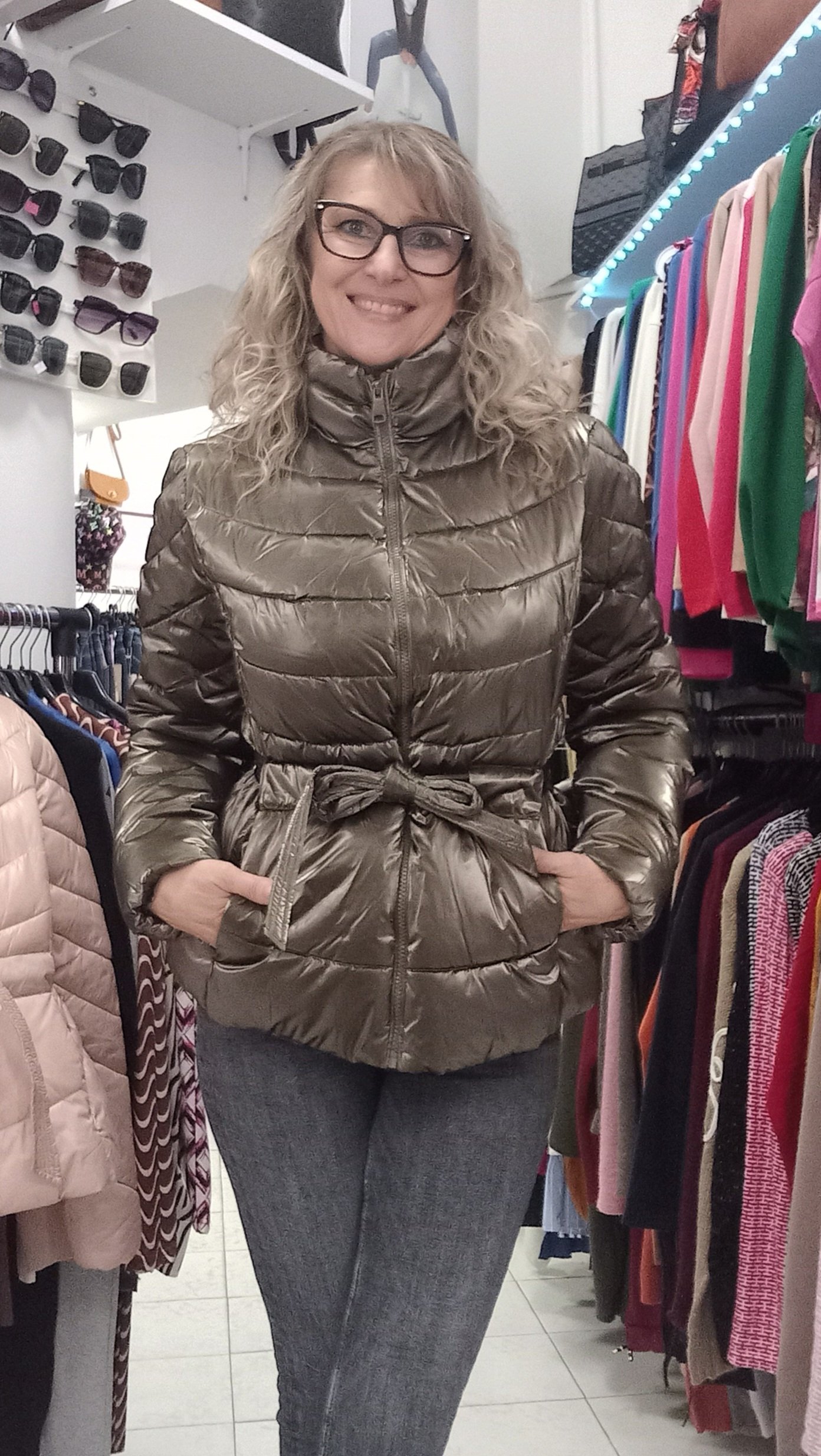 Fényes,bronz színű,öves,bélelt kabát.Őszi-téli-