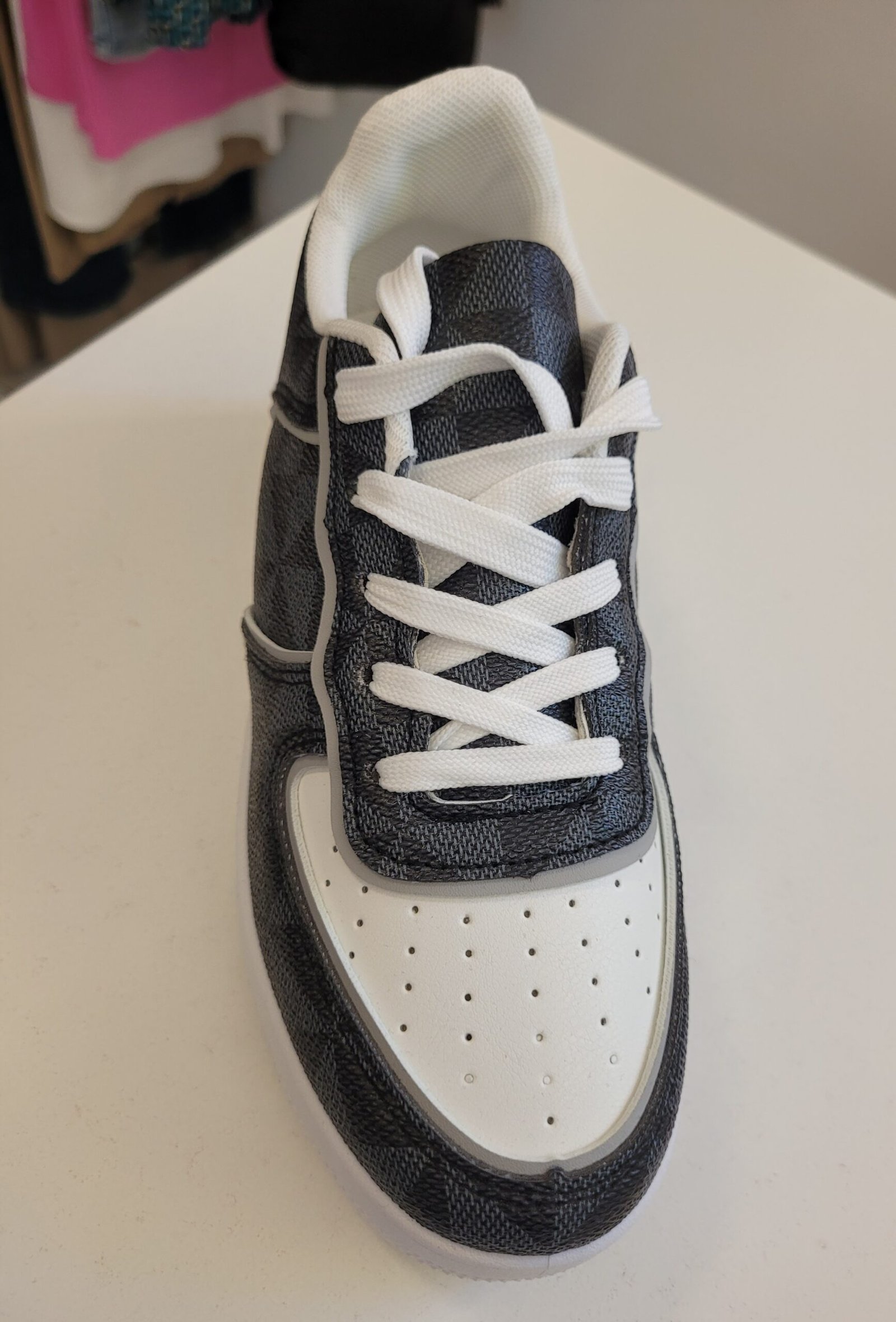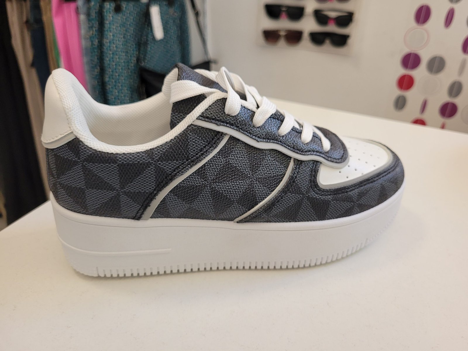 Platformos talpú, szürke-fekete mintás, műbőr cipő.