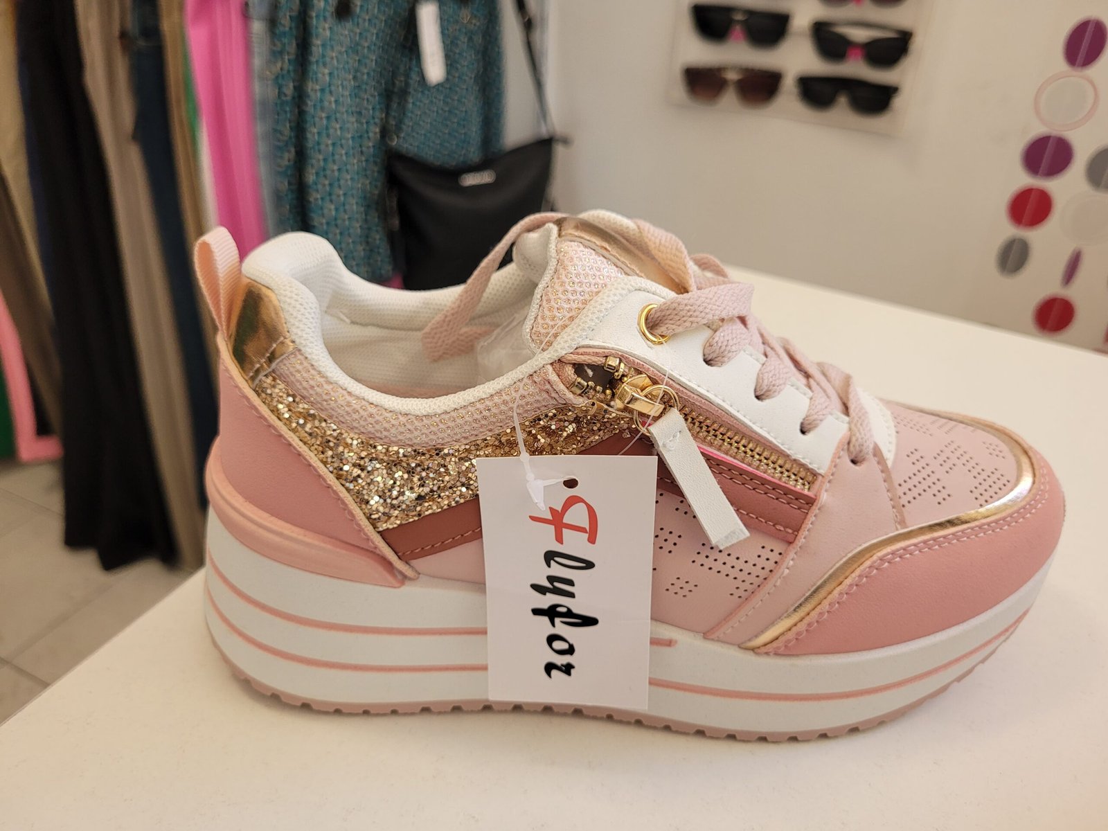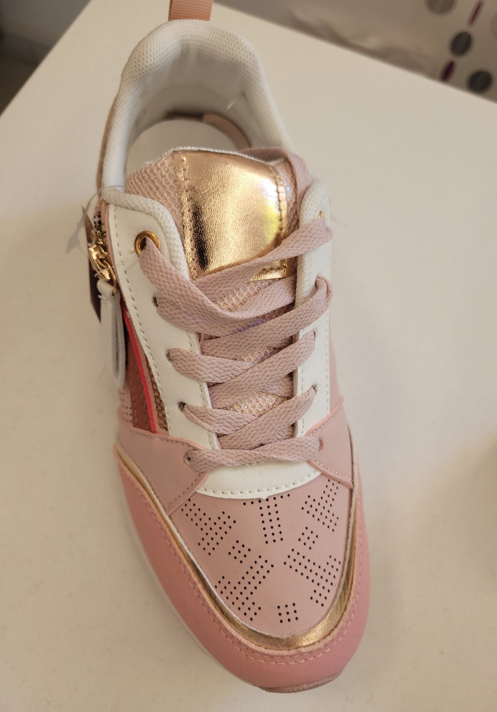 Műbőr cipő, magasított talppal,arany díszítéssel.