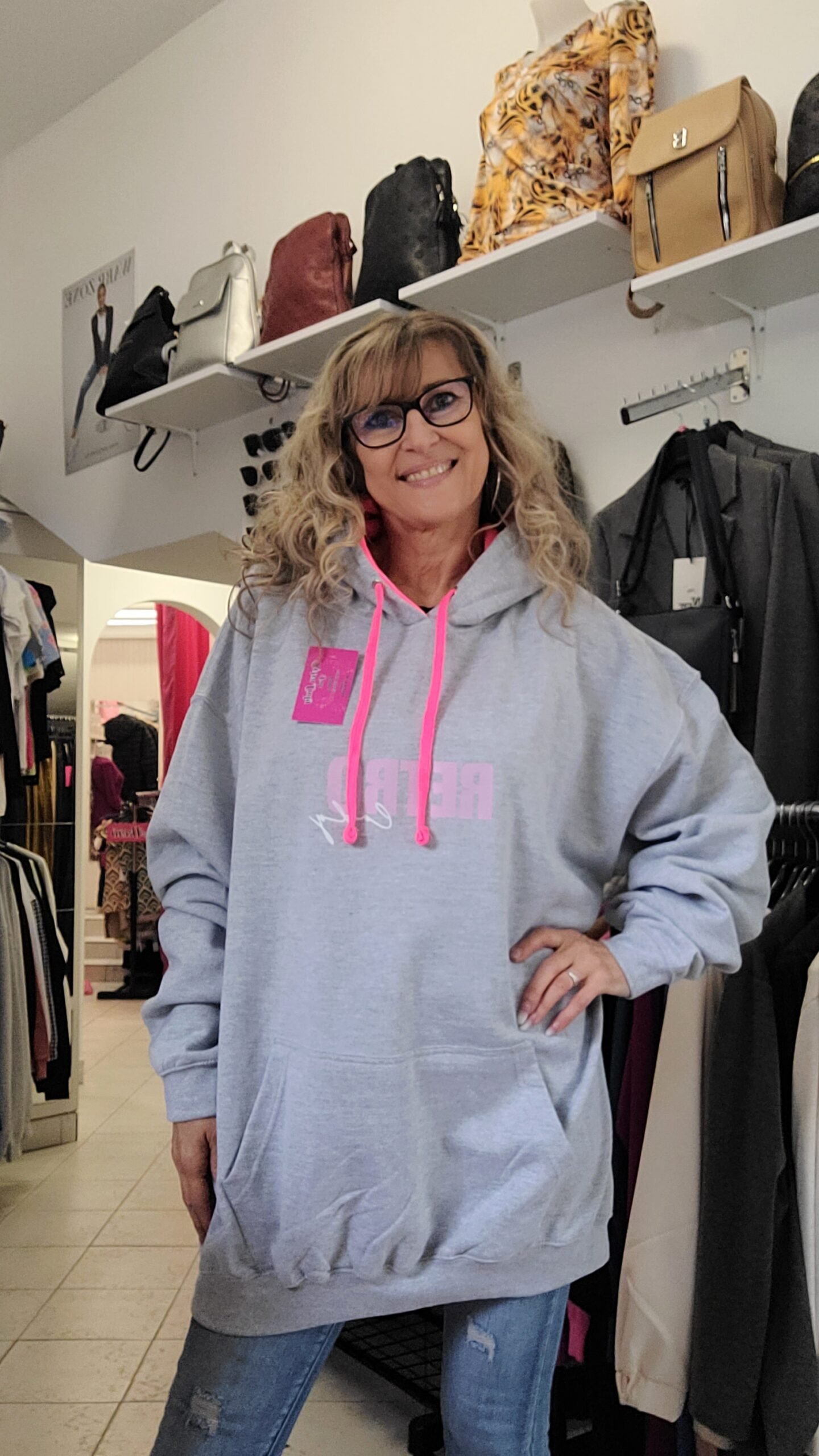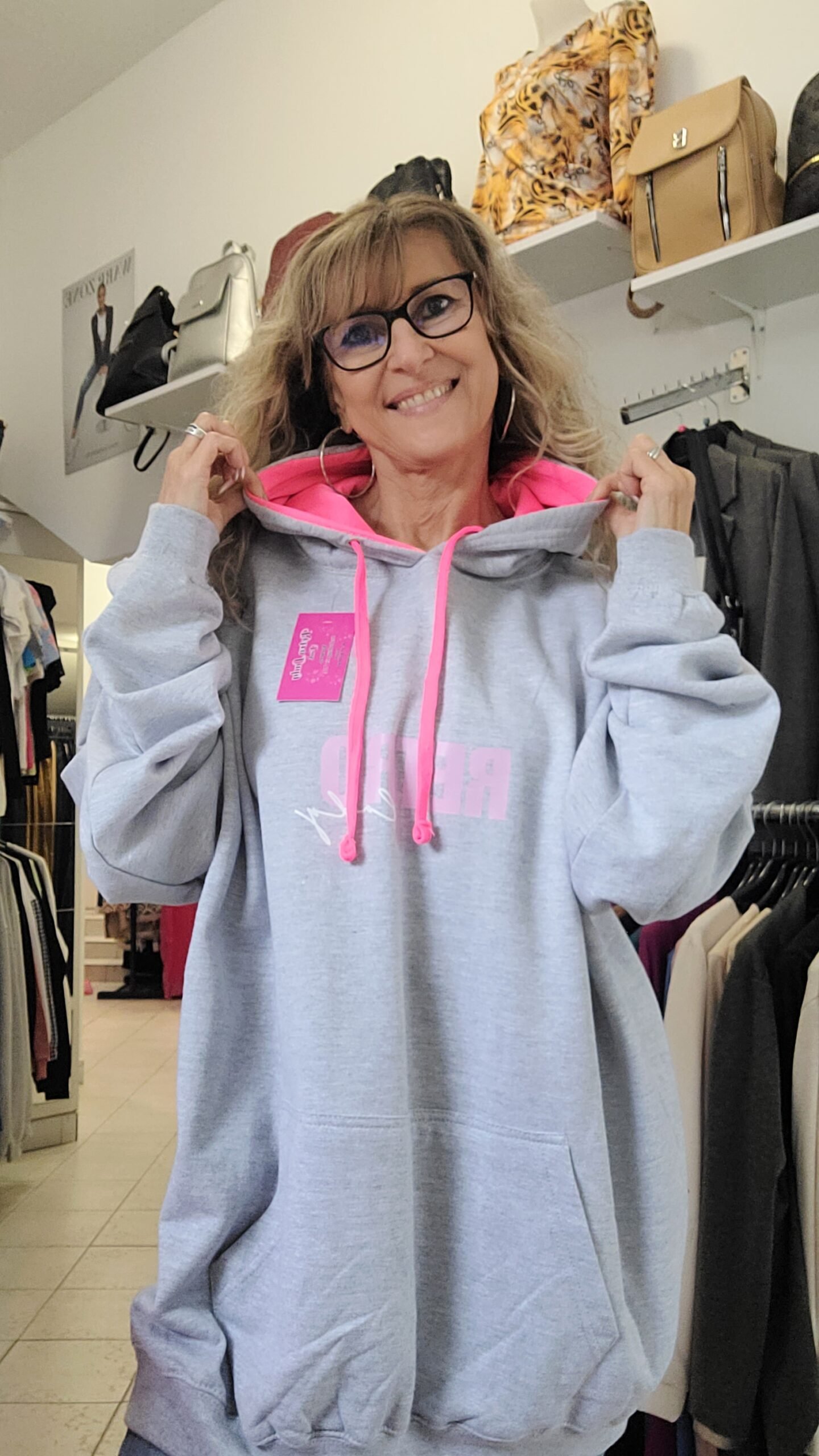 Lezser fazonú,hosszított pulcsi,belül bolyhos pamut anyagból,kenguru zsebbel és kapucnival,amely belül bélelt.Elején nyomott felirattal.Méret nélküli, S-3XL-ig ajánljuk. A modell S.es méretű.