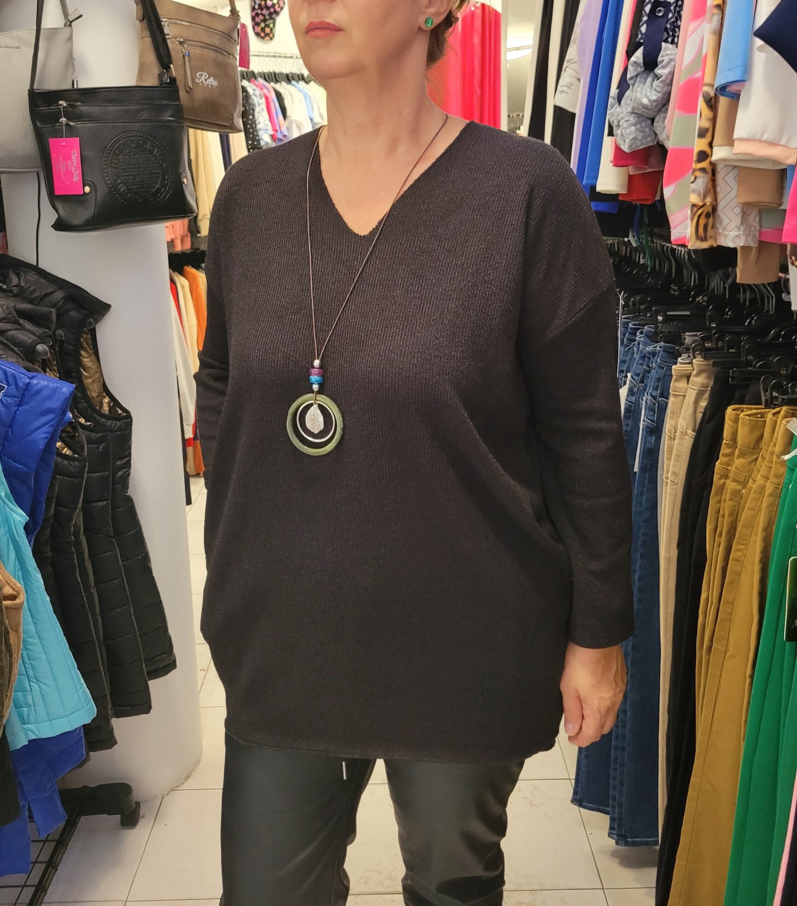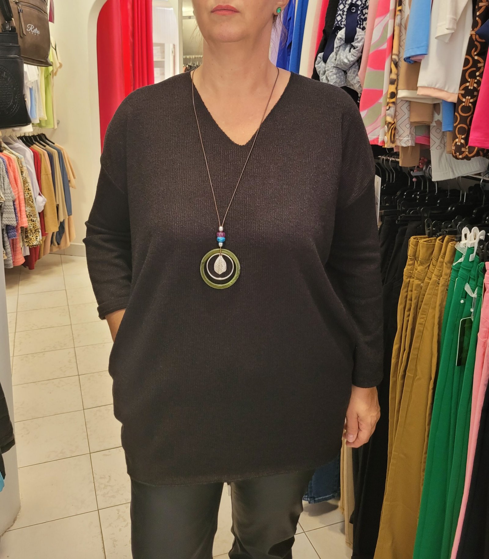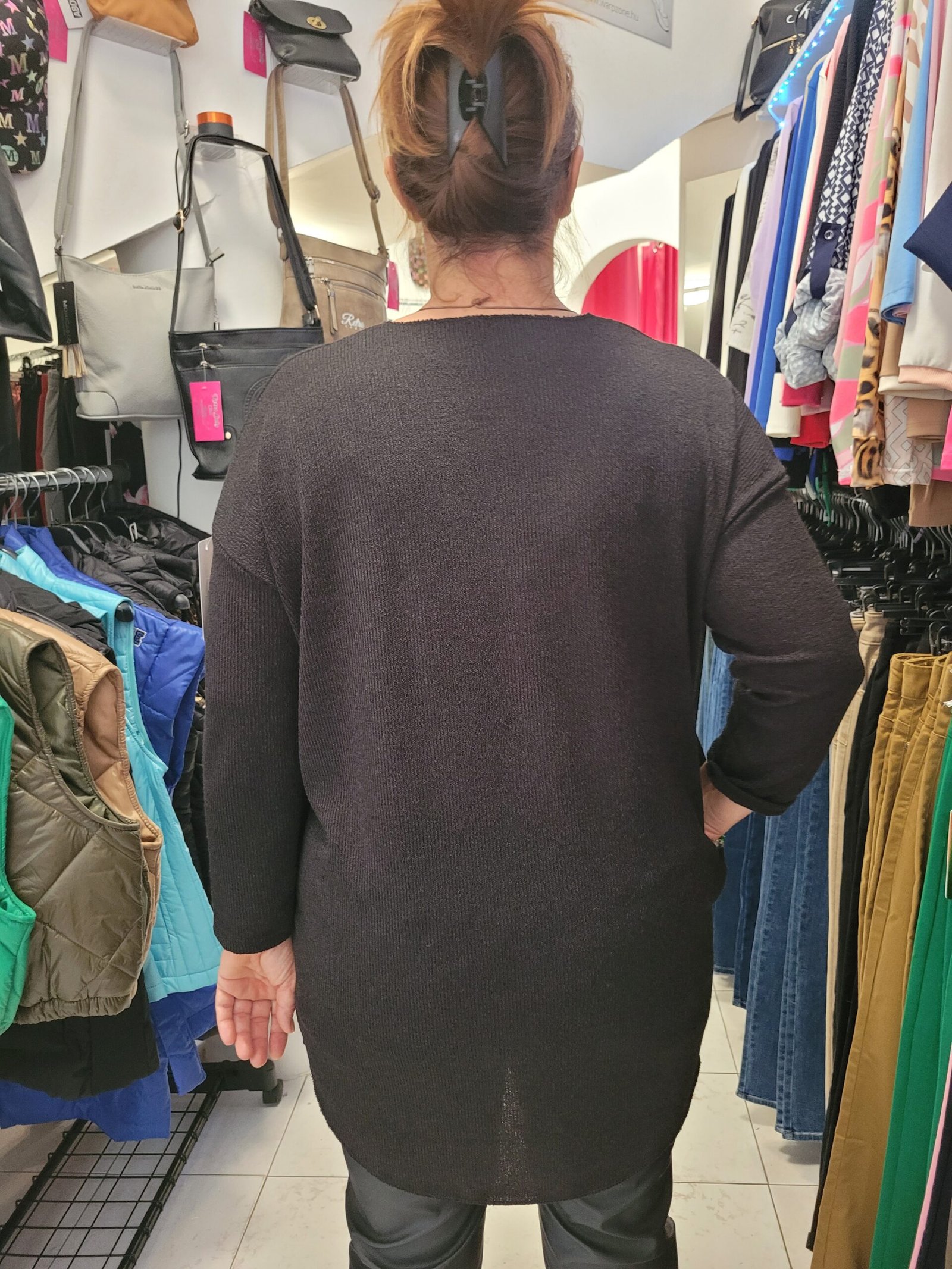 Vékony kötésű,rejtett zsebes, ejtett vállú tunika nyaklánccal.Méret nélküli, L-2Xig tökéletes.